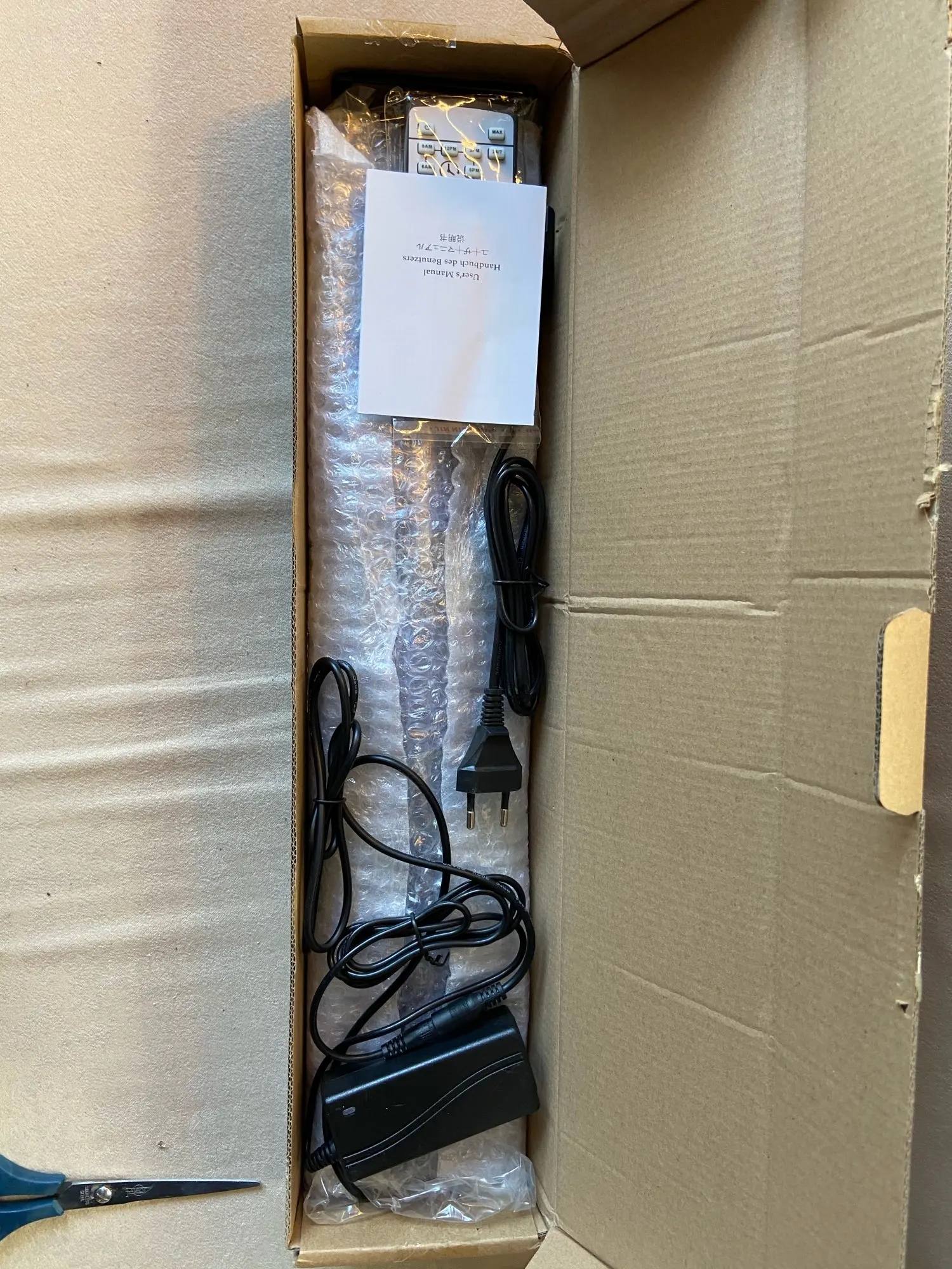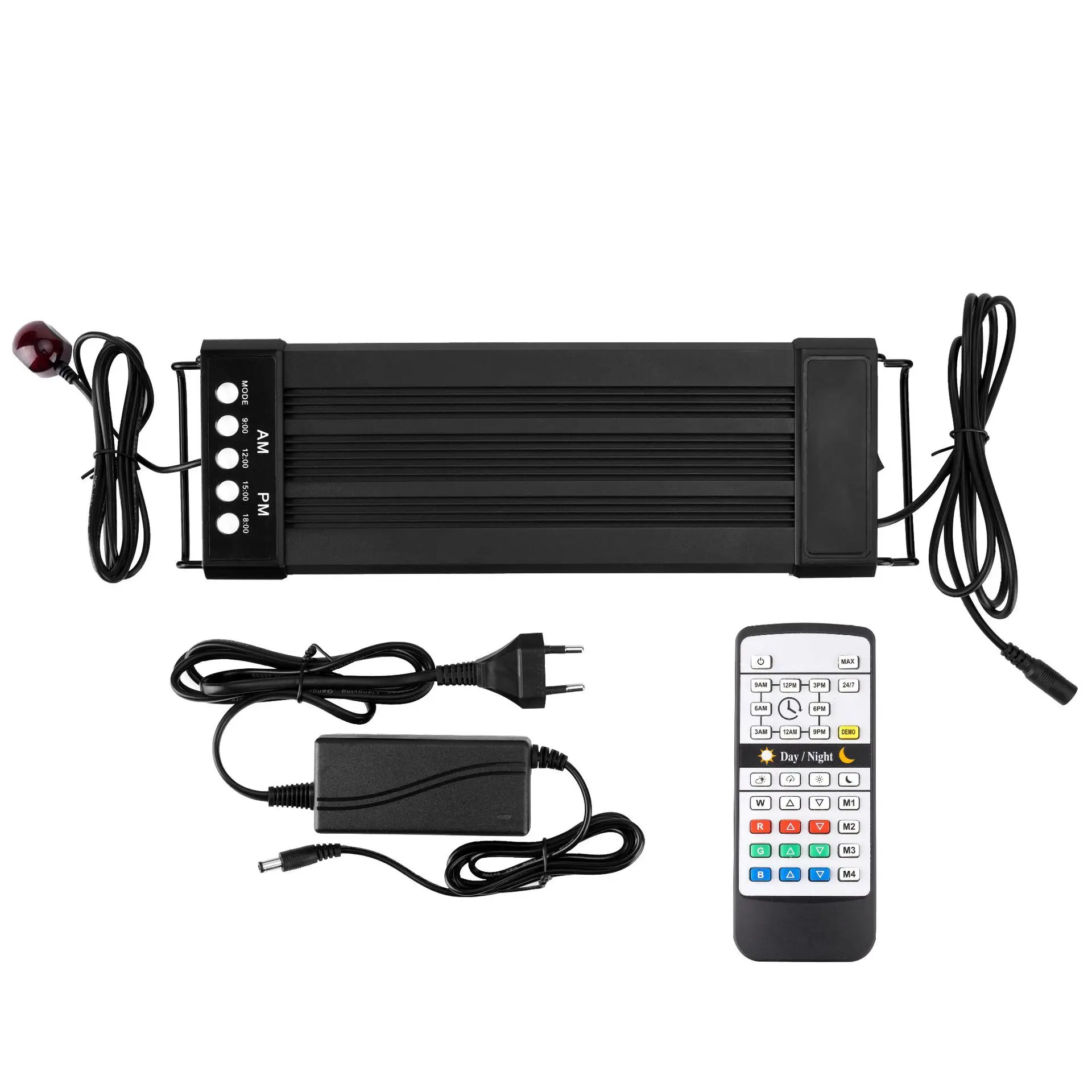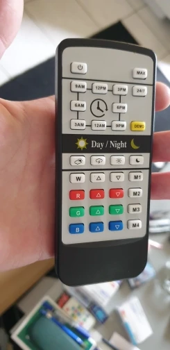 Доставлен за 10 дней в Москву. Свет для 40см высоты кубика нормальный, но не охватывает всю ширину 34см. Пришлось сдвинуть над растениями его. И если рыбки у противоположной стенки то они в тени. Зато стекло будет чище. Режим 24/7 работает, но он не настраиваемый, буду надеяться, что растениям он подойдет и водоросли не попрут. Инструкция на английском, немецком и китайском. Блок питания совмещен с вилкой, а не отдельный. 24v 500mA. Корпус пластиковый, пластик хорошего качества. Особо не греется. Пульт без батарейки, CR2025.