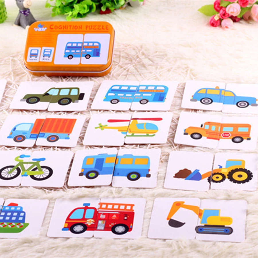 Детские Обучающие пазлы, игрушки для малышей, железная коробка, карты, совпадающая игра, когнитивные карточки, автомобиль, фрукты, животные, жизнь, пазл