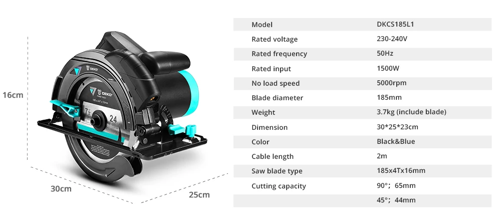 Электрическая циркулярная пила DEKO DKCS185L1, 185 мм1500 Вт, многофункциональная режущая машина, электроинструменты с дополнительной ручкойлазерной направляющей