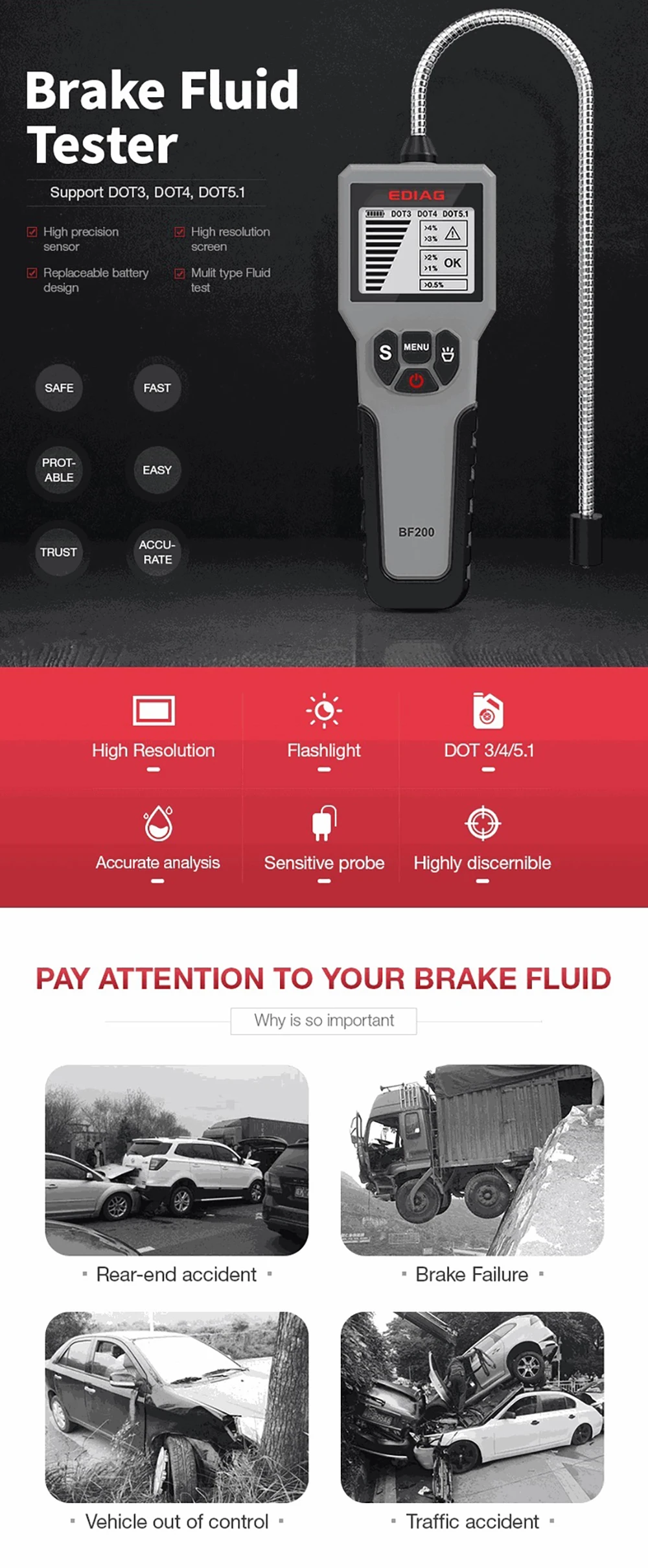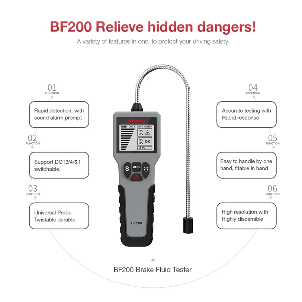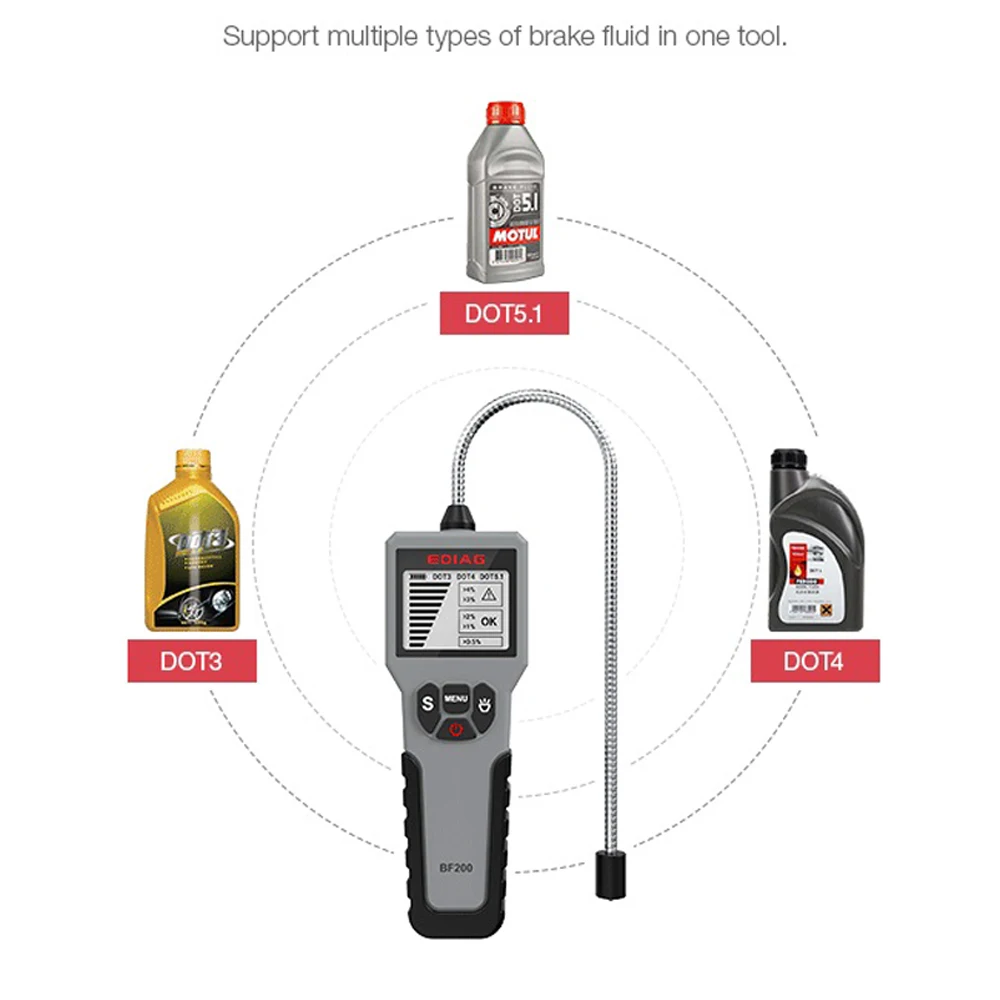Автомобильный тестер масла тормозной жидкости для DOT 3 DOT4 DOT5.1 автомобильный масляный инструмент светодиодный дисплей Каждый водитель знает, насколько важна Тормозная жидкость во время вождения, она непосредственно связана с безопасностью транспортного средства и личного характера, так что в автомобильной промышленности, вот почему так много людей называли тормозную жидкость «защитником». Общий цикл замены тормозного масла составляет 2 года. Тормозное масло само по себе имеет сильные характеристики поглощения воды, оно поглощает влагу в окружающем воздухе, например, мойка автомобиля, влажный воздух, что непосредственно приведет к падению качества тормозного масла и может привести к авариям. 1. Авария сзади 2. Сбой тормоза 3. Транспортное средство выходит из-под контроля 4. ДТП Почему выбирают BF200 тестер тормозной жидкости? 1. Поддержка DOT3, DOT4, DOT5.1 2. С высокоточным датчиком 3. Светодиодный дисплей с подсветкой 4. Поддержка многотипного тестирования жидкости 5. Со сменным дизайном батареи 6. Поддержка обнаружения содержания воды 7. Поддержка высокоточного измерения 8. С высокочувствительным зондом 9. Супер простота в эксплуатации BF200 тестер тормозной жидкости Спецификация Модель: BF200 Описание: тестер тормозной жидкости Материал: АБС-пластик Размер: 6,14 дюймов * 2,17 дюймов * 0,94 дюймов Температура: -10 °C ~ 50 °C Батарея: 2 шт. AAAA батареи (не входят в комплект) Диапазон испытаний: DOT3, DOT4, DOT5.1 Дисплей: экран с высоким разрешением Цвет: серый и черный