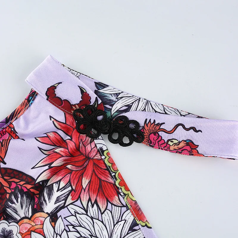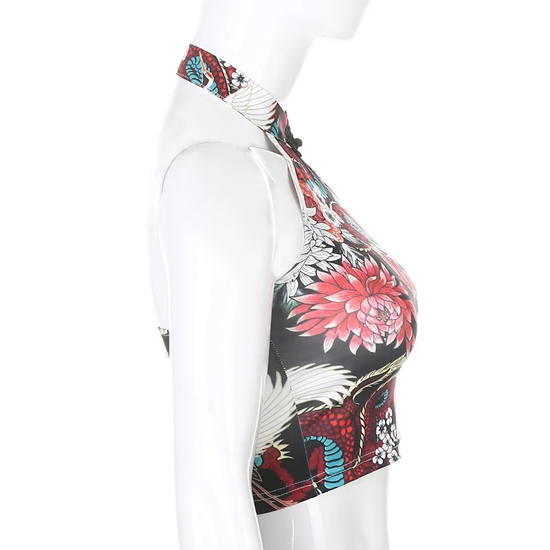 Женский укороченный топ-бюстье с лямкой на шее и принтом дракона