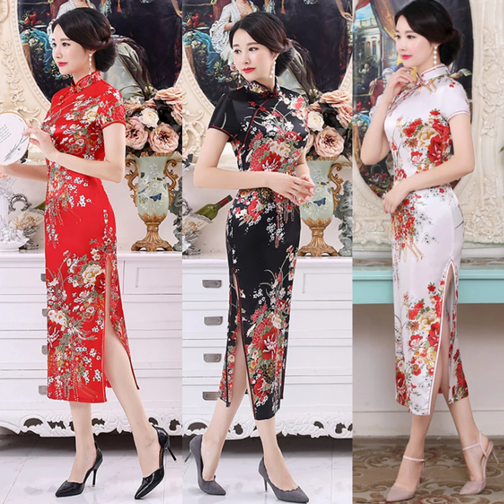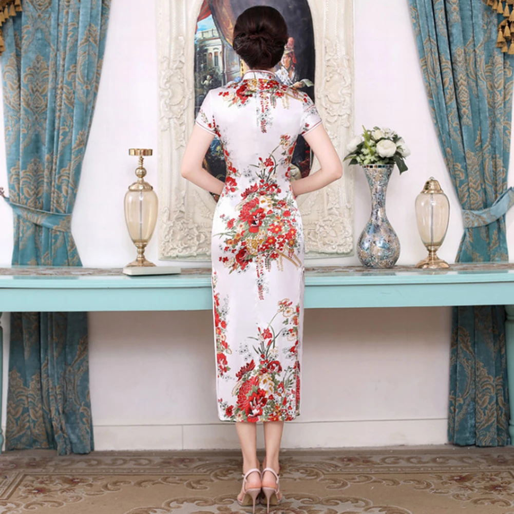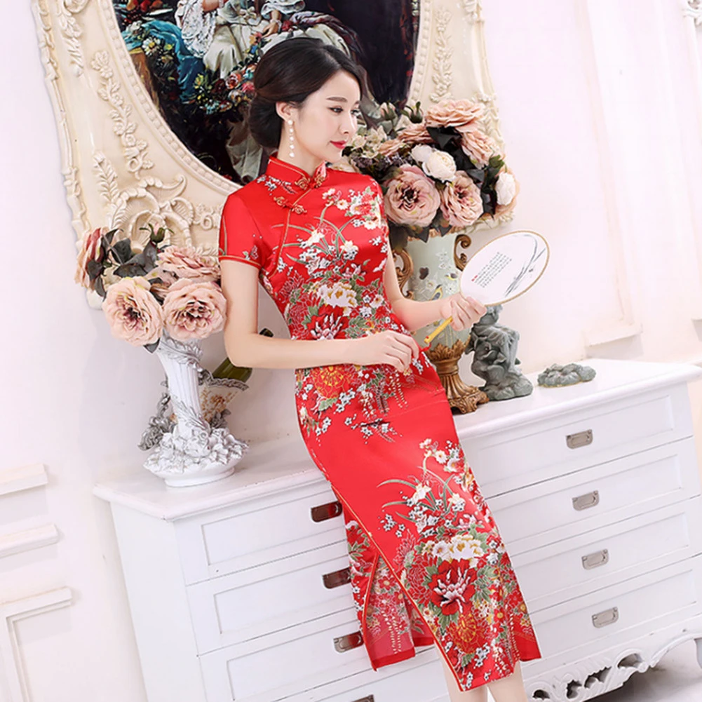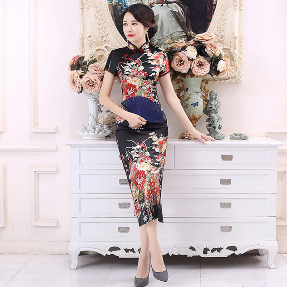 Китайское традиционное платье с цветочным принтом, элегантное платье с коротким рукавом, Cheongsam, стоячий воротник, облегающее платье, женское платье Cheongsam