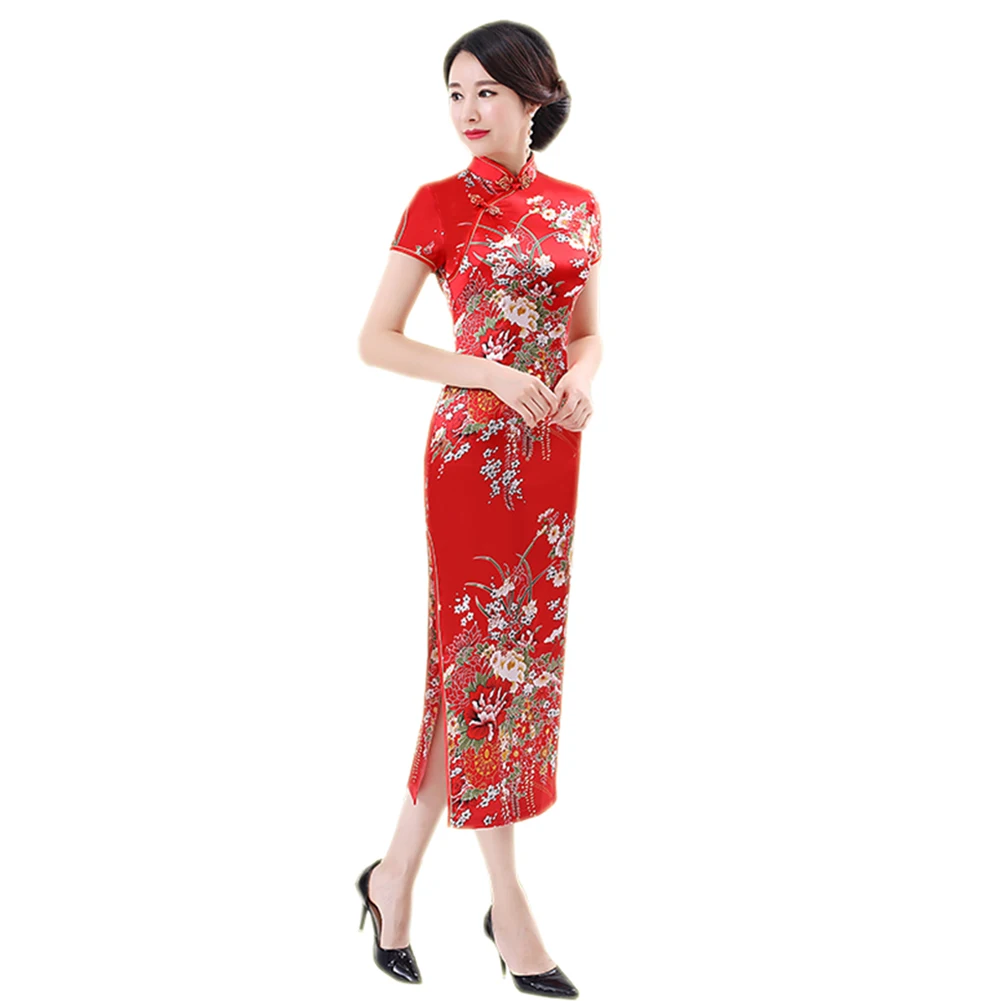 Женское платье Чонсам в китайском стиле с цветочным принтом, стоячим воротником, коротким рукавом, разрезом, вышивкой, тонкое облегающее платье