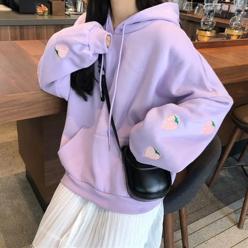 Женская толстовка в стиле Харадзюку, розовая толстовка с вышивкой клубники и лаванды, свободные топы с длинным рукавом, женская одежда