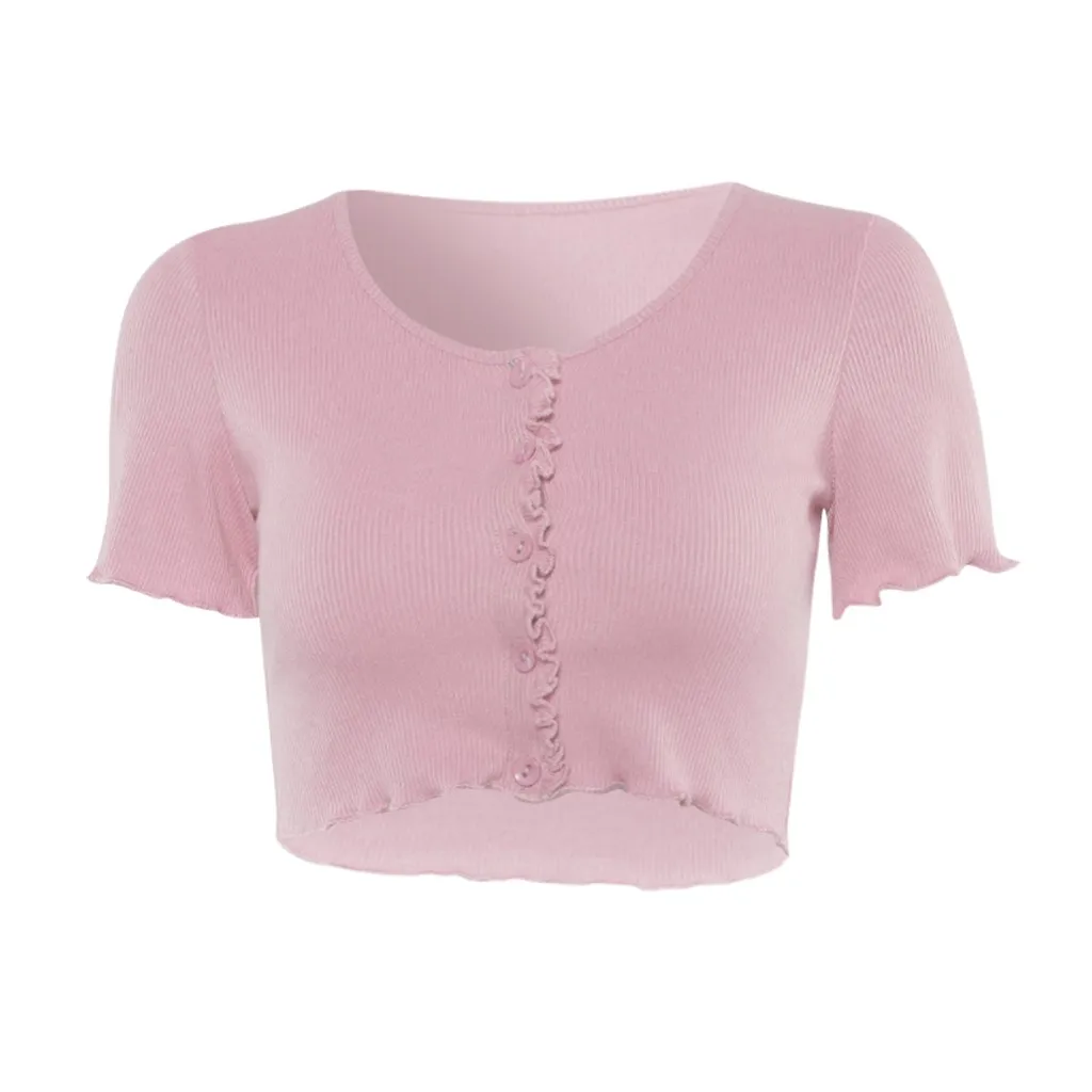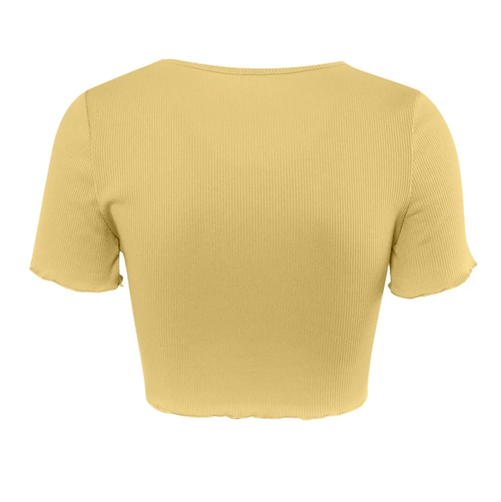 2020 Женская однотонная ребристая короткая рубашка с коротким рукавом и пуговицами.