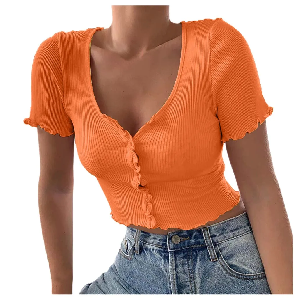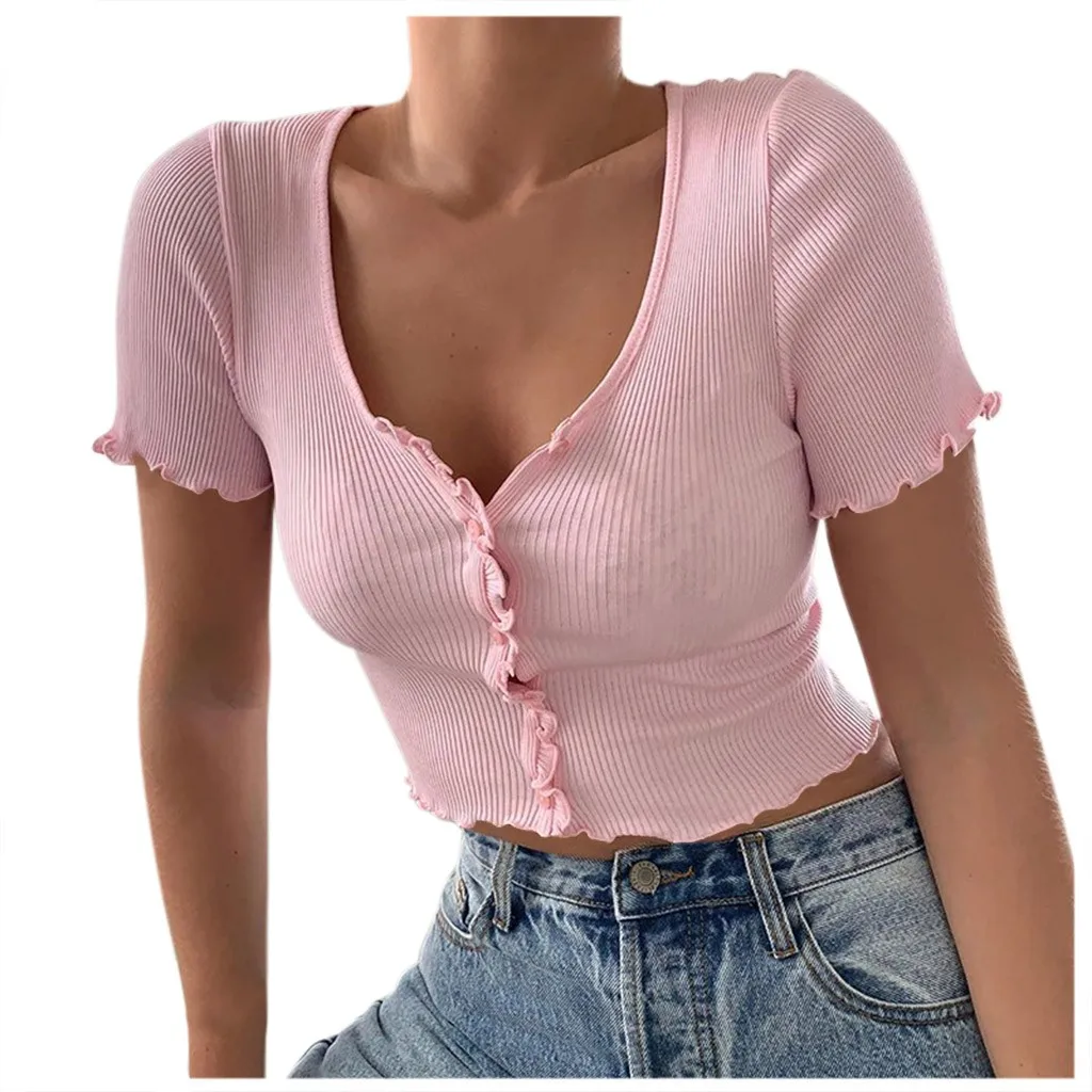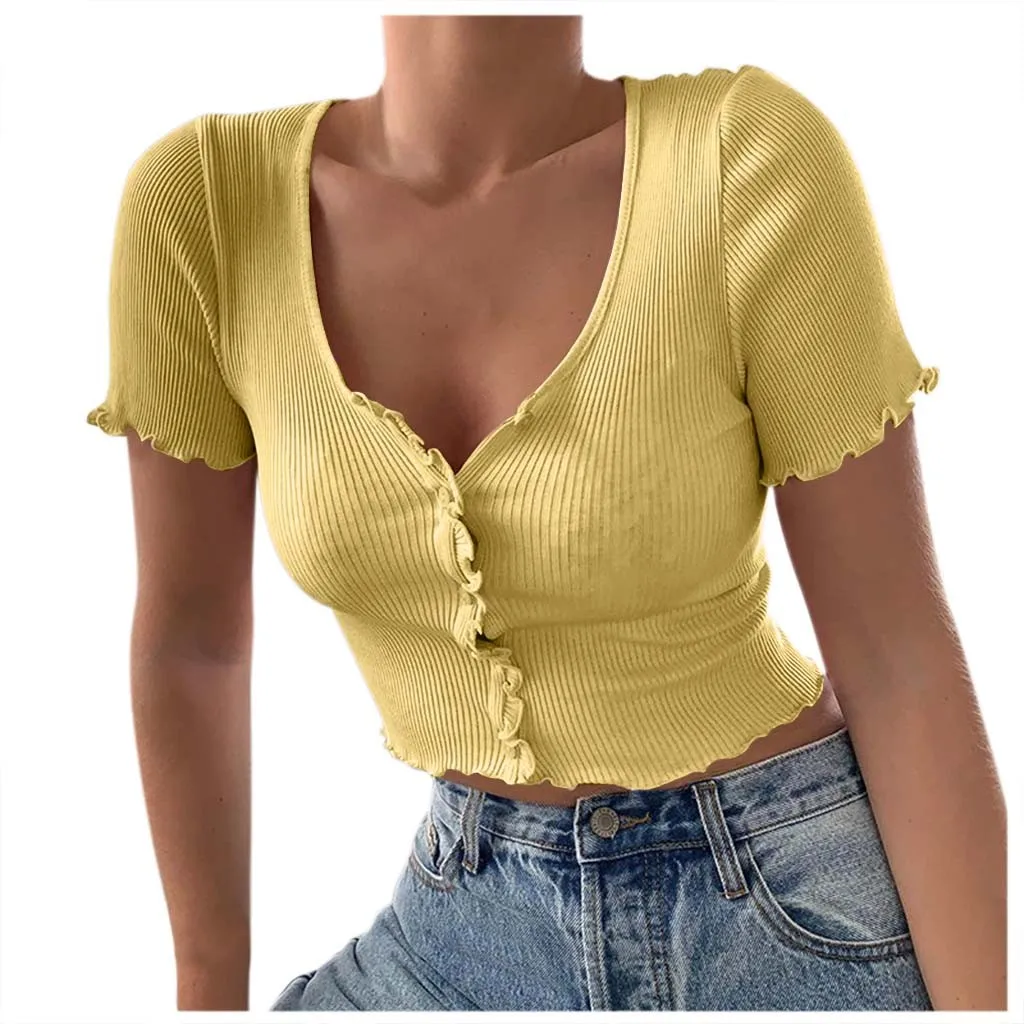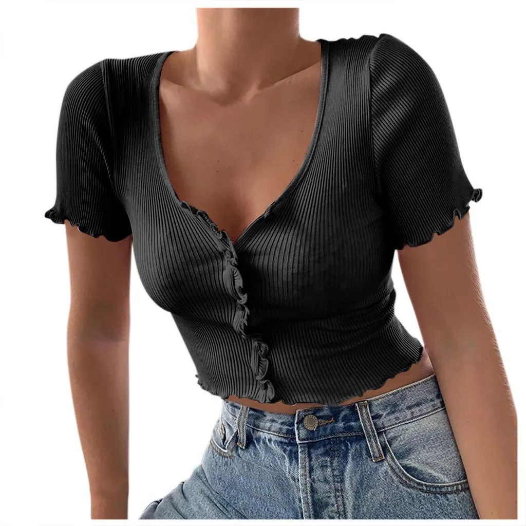 Женская однотонная короткая рубашка с v-образным вырезом и коротким рукавом в рубчик