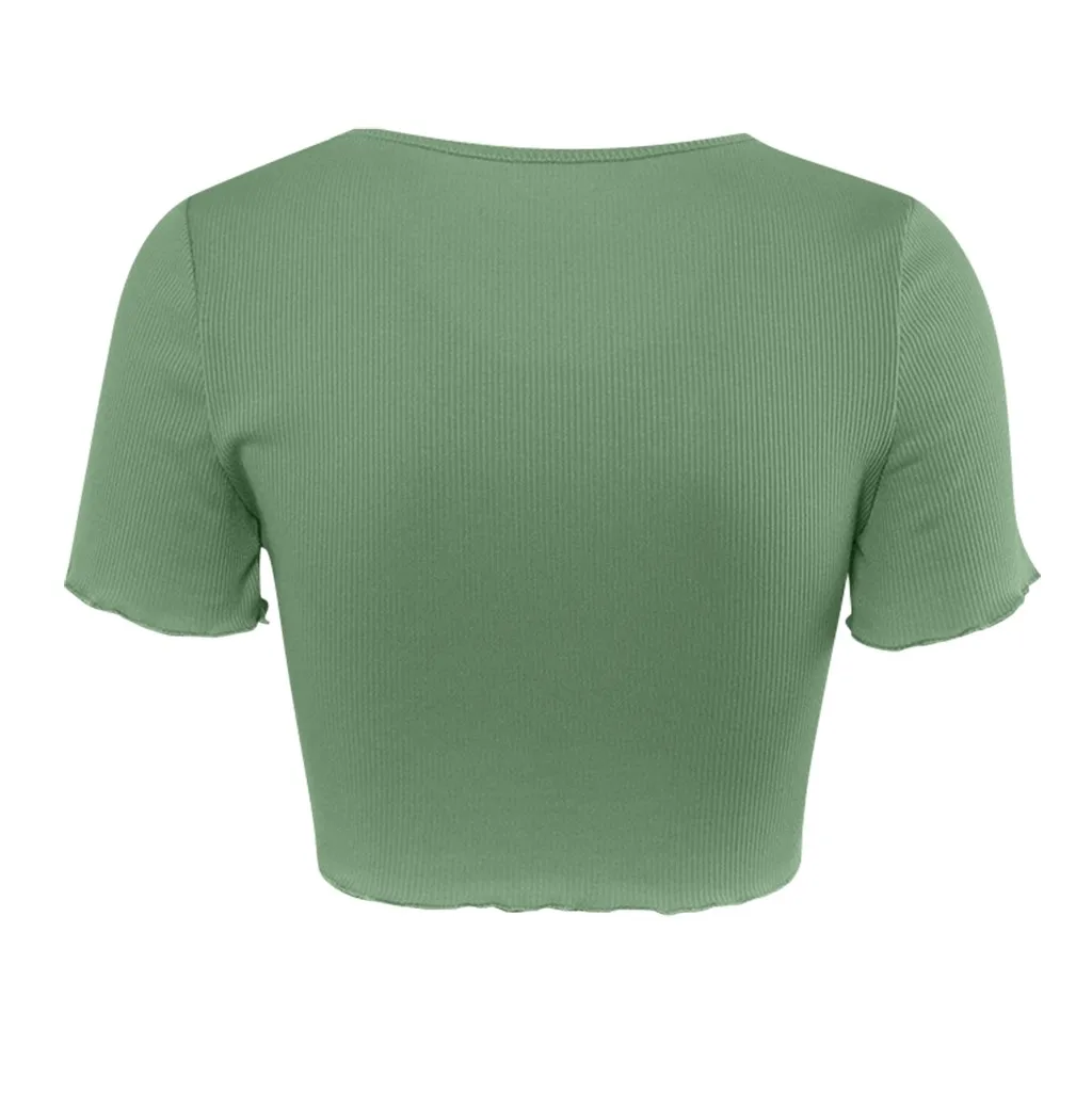 Женский эластичный укороченный топ с рюшами на рукавах, модель 2020 года, летняя Соблазнительная блузка в рубчик, на пуговицах, зеленого, синего цветов, Прямая поставка # g3