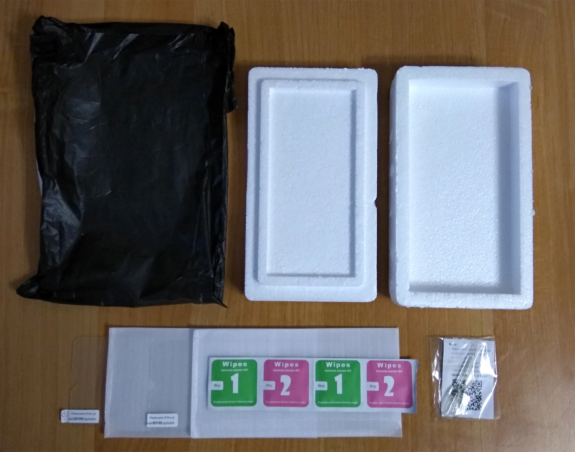 Стекло по размеру.По две салфетки,клей.Я с трудом установил стекло,самые края не приклеивались,причину не знаю,всё делал по инструкции,да и не впервые устанавливал стекло на телефон,только другой модели.Всем удачи.