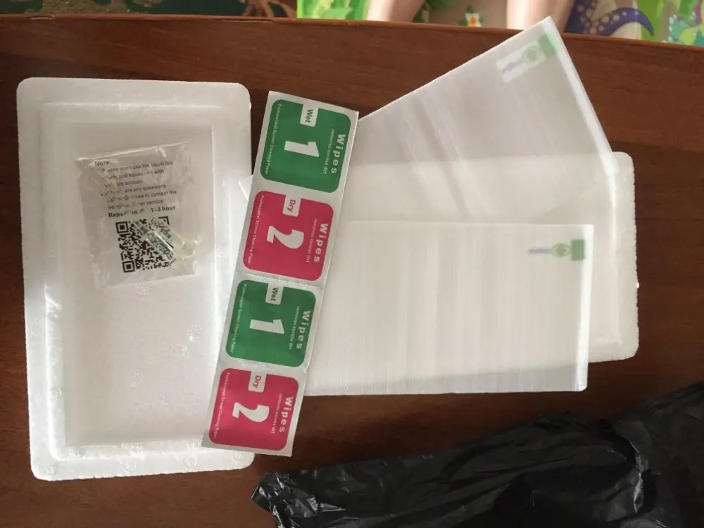 В целом все хорошо, упаковка достойная, все пришло целое, в комплекте также есть малюсенькие влажные и сухие салфетки, и жидкость для проклеивания краев стекла. На одном из стекол были очень трудно оттираемые следы от каких-то цилиндрических предметов, видно на втором фото.
