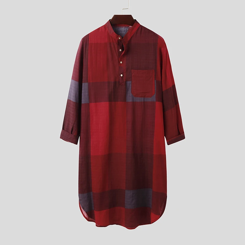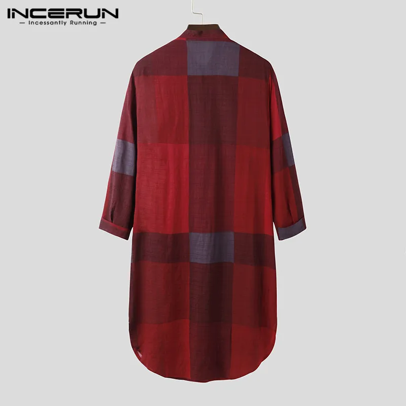 Ночная рубашка INCERUN мужская с длинным рукавом, Хлопковая пижама с круглым вырезом и карманами, модная клетчатая Пижама, уютная одежда для сна на пуговицах, размера плюс 7