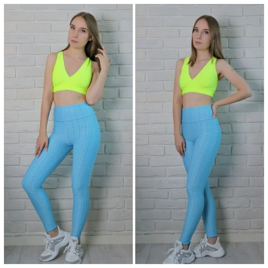 На свои параметры: талия - 62см.; бедра - 86см и рост - 165см. я заказала самый маленький размер S. Леггинсы сели отлично. Длинна с небольшим запасом. Резинка плотная но не давит. Необычная фактура ткани (видео на фото). Состав ткани: 92% - полиэстр и 8% - спандекс. Ткань приятная на ощупь, очень эластичная, немного просвечивает. При занятии спортом штаны движения не сковывают.