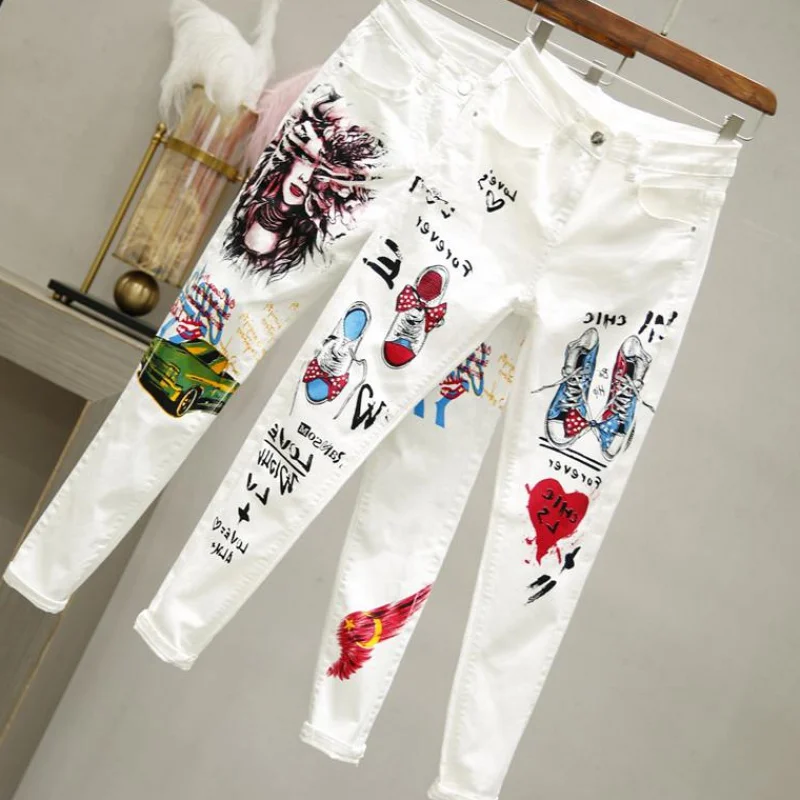 Мода размера плюс, женские джинсы белые стиле граффити из мультфиль...