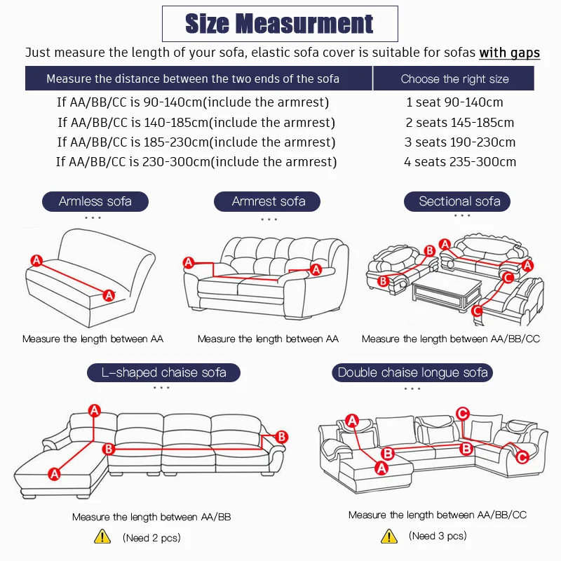 2. У нас есть 4 размера на выбор, пожалуйста, проверьте правильный размер вашего дивана, если вы не знаете, как выбрать правильный размер, чтобы измерить размер или сообщить нам свой размер дивана, мы поможем вам.