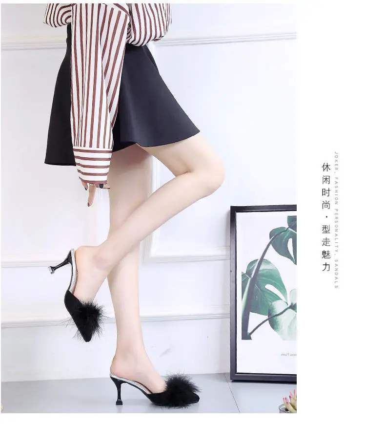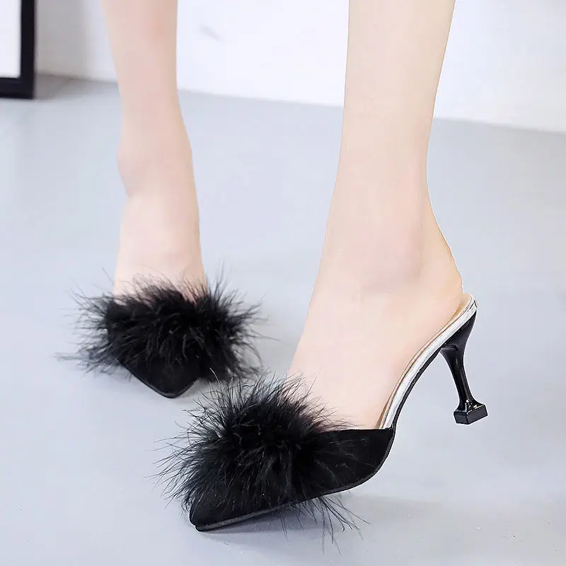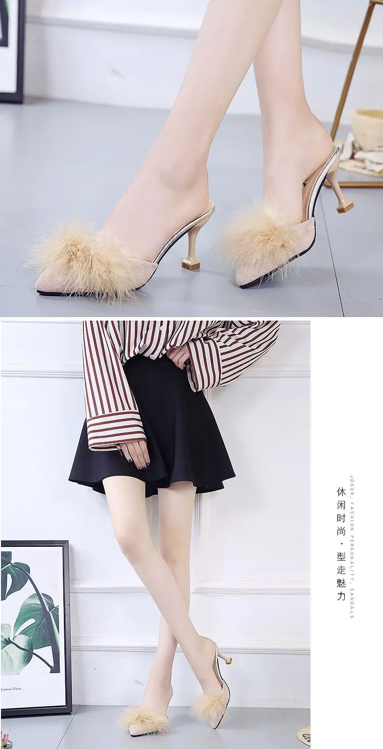 Новые летние туфли-лодочки, женская обувь, сандалии, прозрачные, с перьями, кристаллами, на высоком каблуке, с мехом, с острым носком, искусственные меховые Тапочки