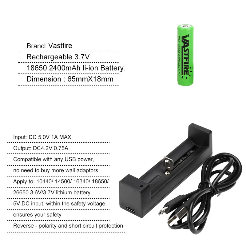 Модель: 501BДальность действия: 300 ярдов-Режимы: 1-Масштабируемый фокусСветодиодный: белый 1000 люменASPERICAL объектив: 31 мм объективРежим: 1 режим от высокогоАккумулятор: 1x18650 аккумулятор (как ваш chioce)Батареи Вход Напряжение: 3,7-4,2 VВодонепроницаемость: только защита от брызгКорпус Диаметр: 25,4 мм (дополнением к любому наряду 25,4 мм кольцо или крепление)Материал изделия: алюминиевый сплавЦвет: черныйРазмеры: 5,3 "x 1,3" x 1,3 "(фонарик)Количество: 1.Цвет: белыйПерезаряжаемый литий-ионный аккумулятор 3,7 V 18650 2400mAh.Нет эффекта памяти, перезарядка до 1800 циклов.Изготовлен из высокомощных продуктов и экологически чистый.100% контроль качества каждой батареи.Идеально подходит для фонарика, фото камеры.Размер батареи: 65 мм (высота) x 18 мм (диаметр).