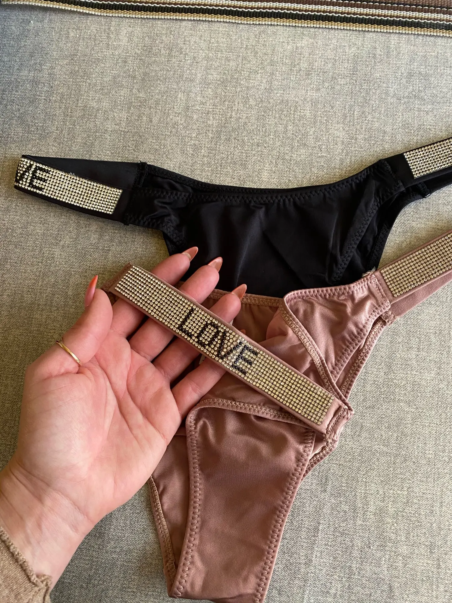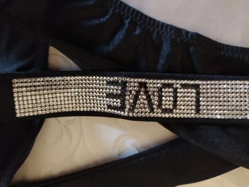 Трусельки классные, все стразы на месте, блестят, шелковистые на ощупь, хорошо тянутся. Но запах ядовитейший, аж в голову бьет. Посмотрим , что будет с запахом и стразовой лентой после стирки. Но первое впечатление - огонь! Пошла стирать)))