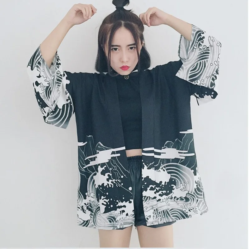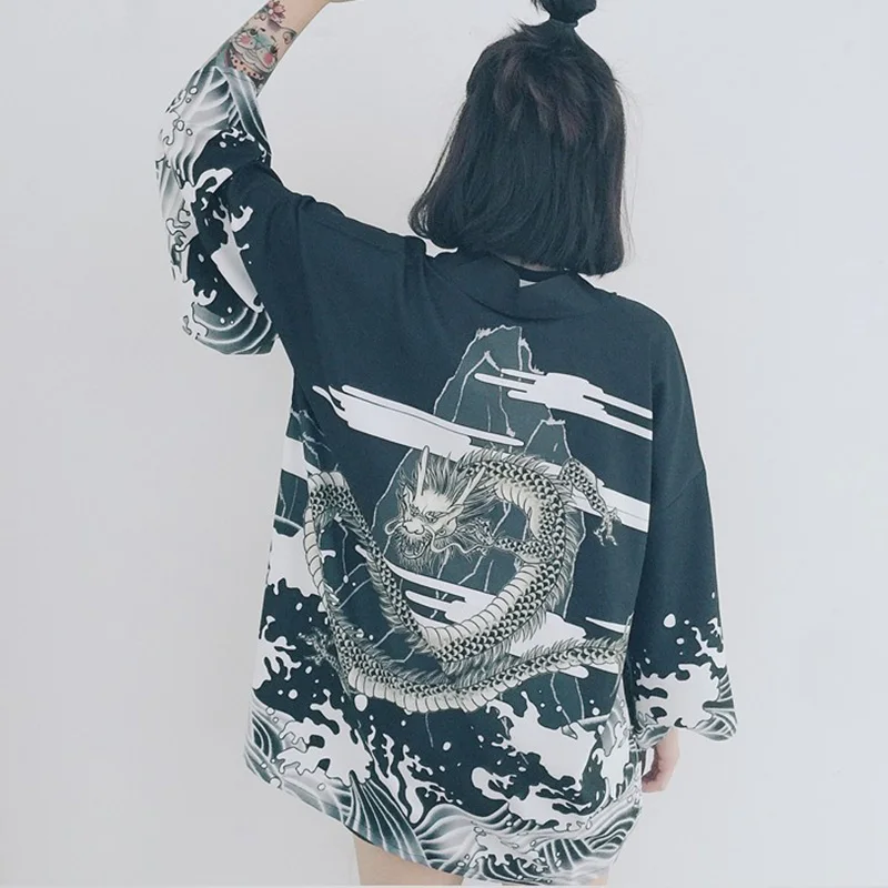 Кимоно JuneRain в японском стиле с рукавами летучая мышь, винтажная рубашка в стиле Харадзюку с принтом волн и ветра, верхняя одежда с драконом