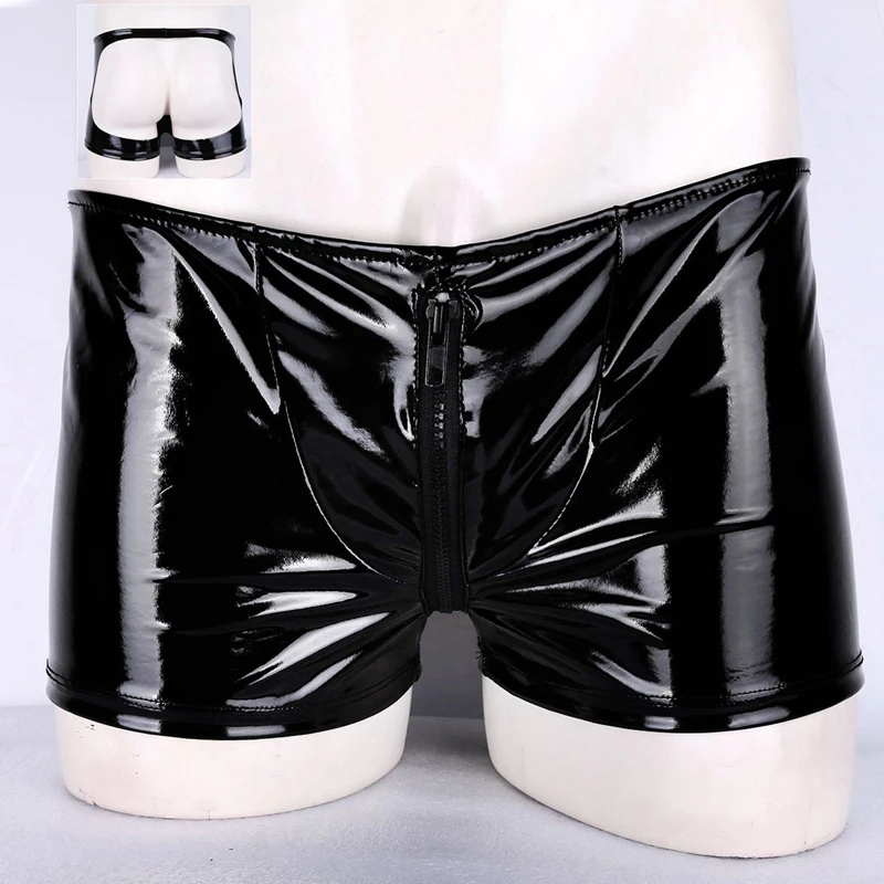 Сексуальные мужские трусы-боксеры с открытым задником черного цвета, мужское нижнее белье, хит продаж, блестящие металлические лакированные кожаные трусы-боксеры с застежкой-молнией, латексные трусы
