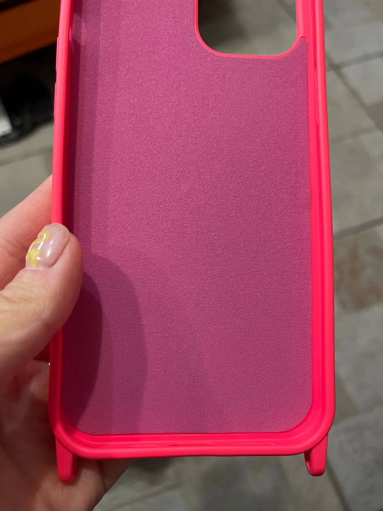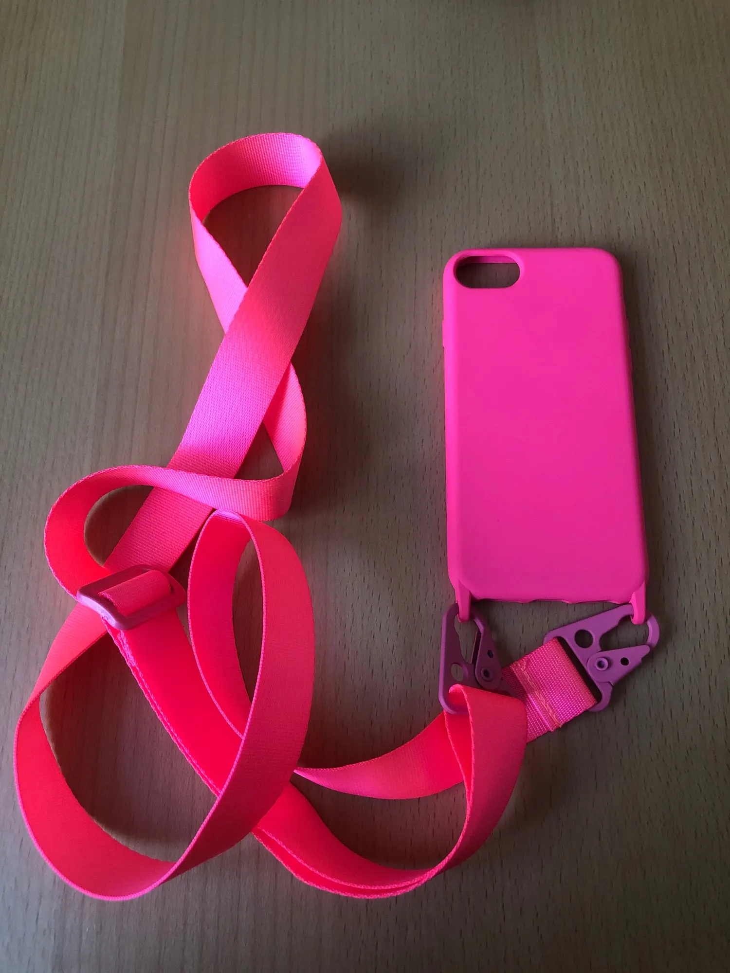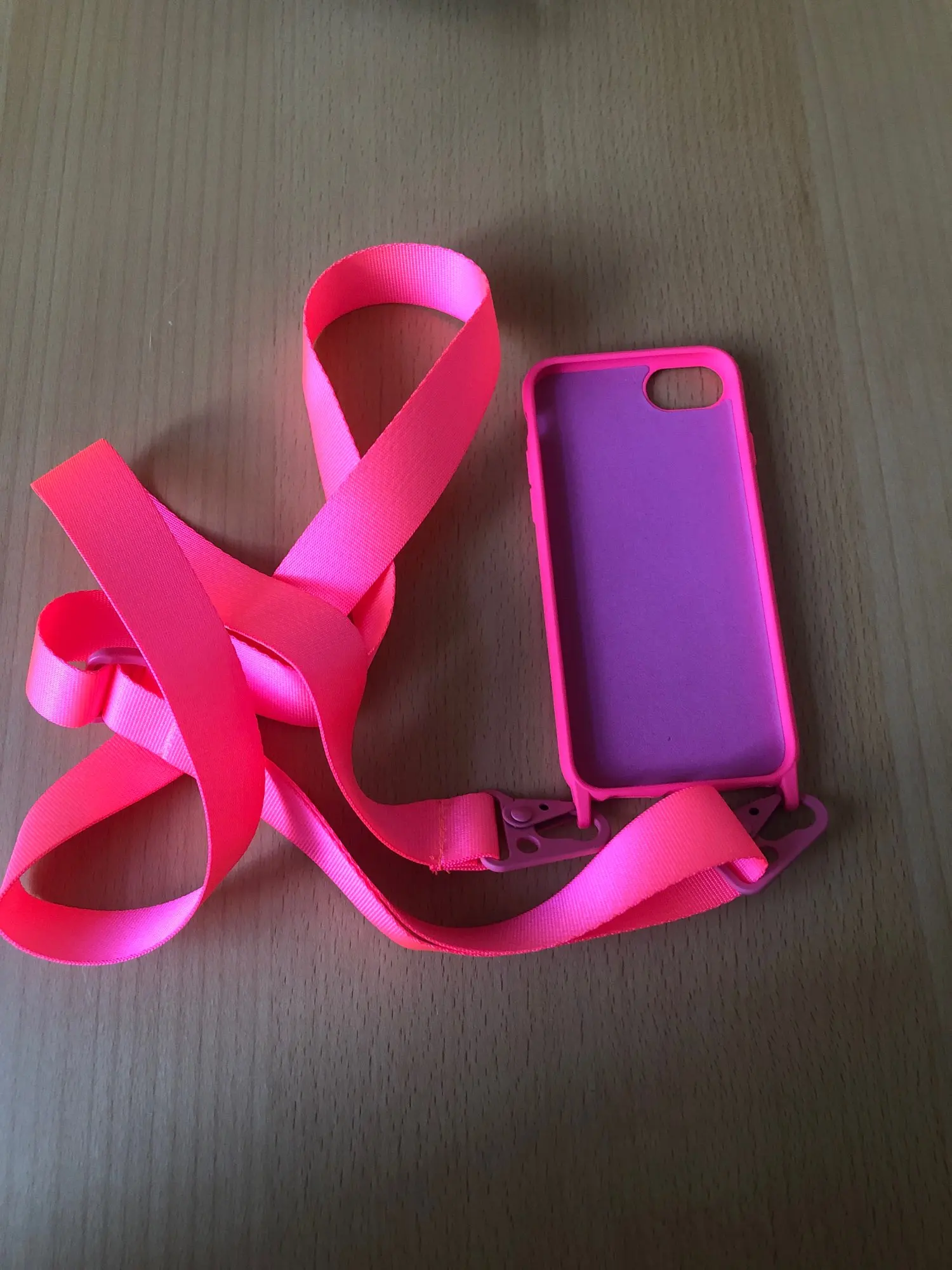 Чехол очень яркий и даже неоновый, ожидала более малиновы цвет, но этот ничем не хуже) очень качественный материал чехла и ремешок выглядит очень достойно, чехол приятный на ощупь и телефон хорошо держится в нем) также спасибо за быструю доставку! Рекомендую)