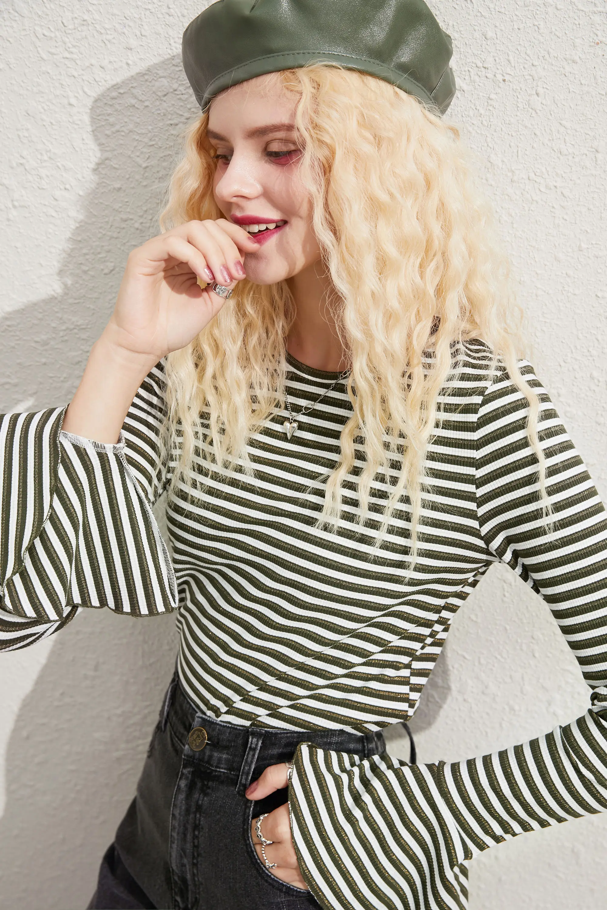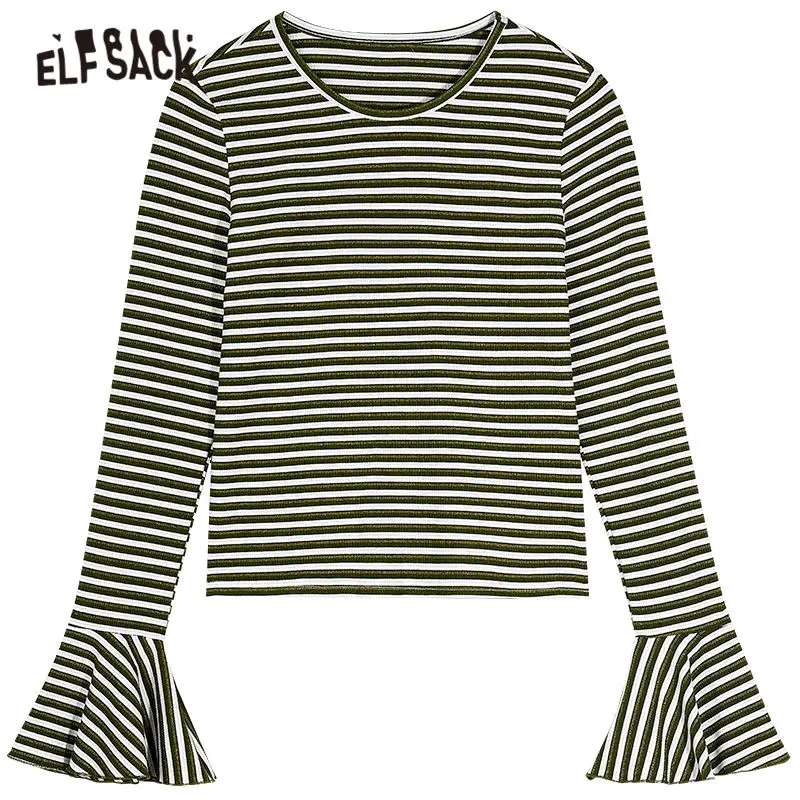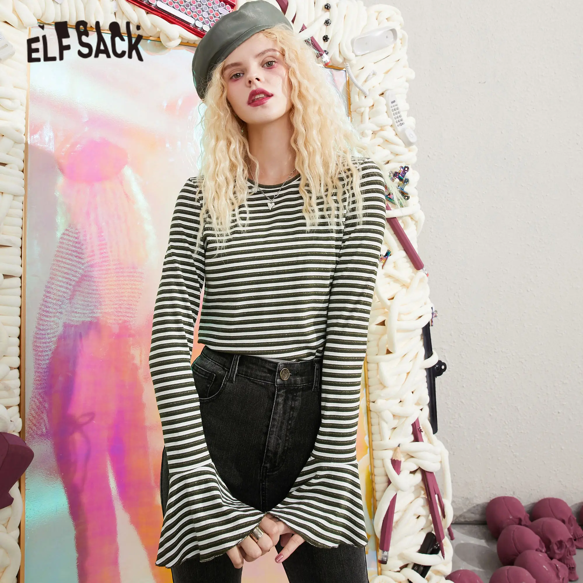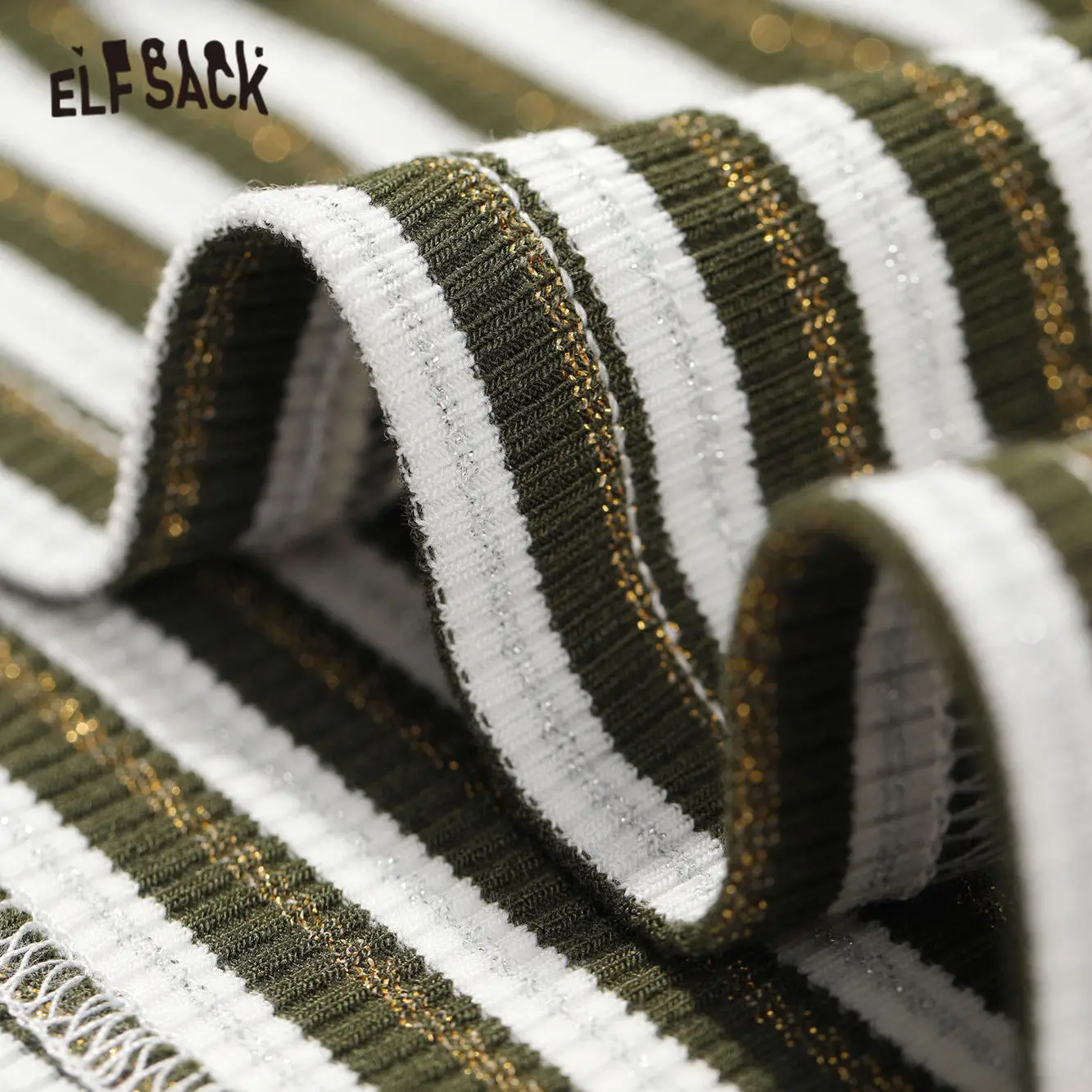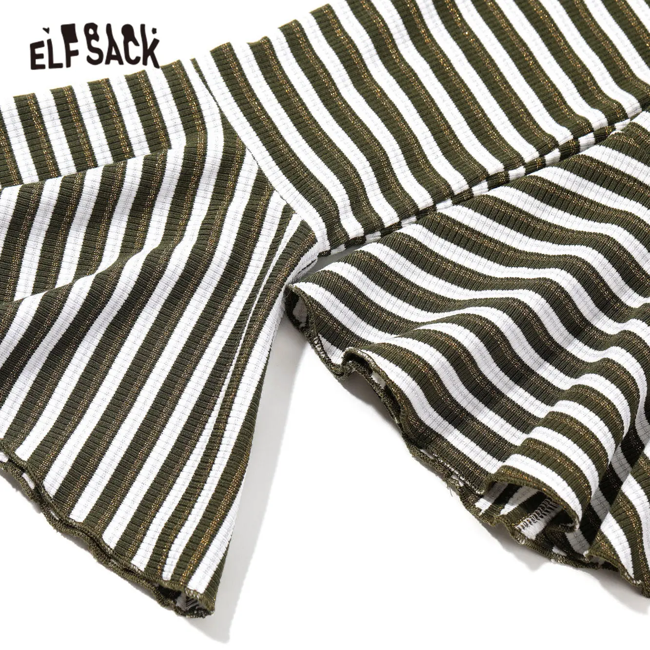 Женский вязаный Повседневный пуловер ELFSACK, зеленый полосатый свитер с рукавами-бабочками в Корейском стиле на осень 2020