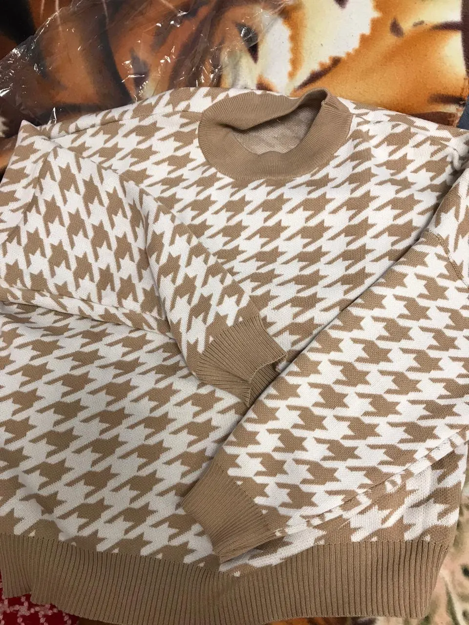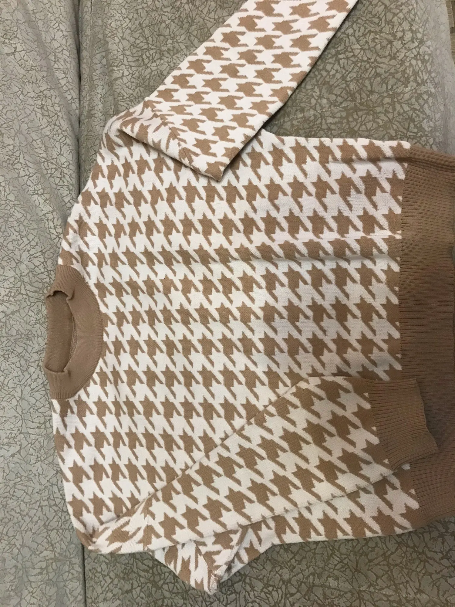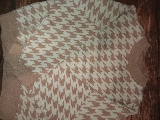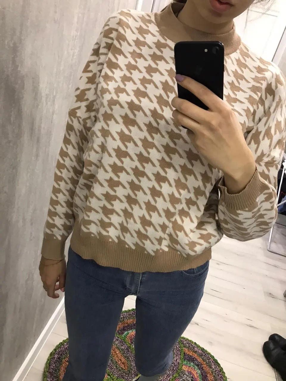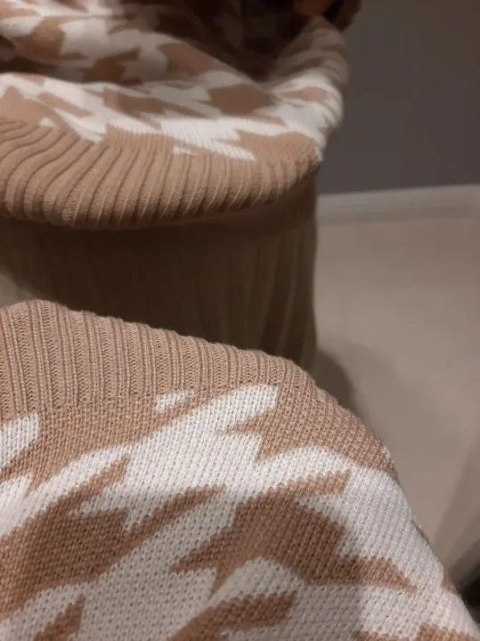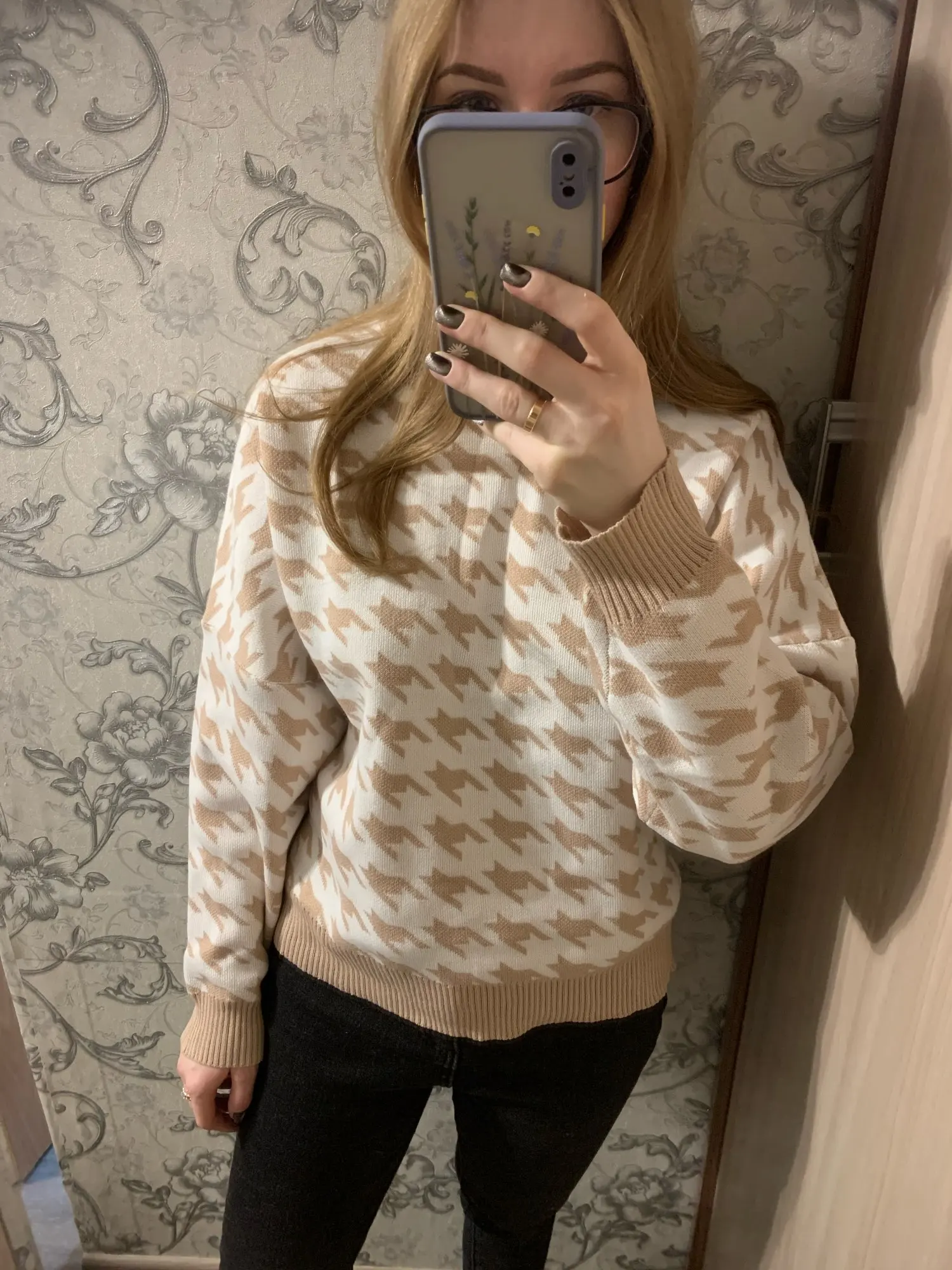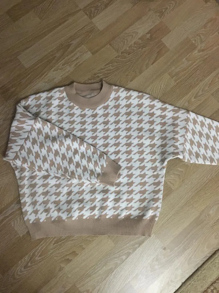 Свитер очень приятный, хороший. Швы аккуратные. Думала, что будет немного другой цвет( на фоне гусиной лапки Белый цвет, ожидала бежевый). Заказывала 11 ноября, пришел 19 декабря. В принципе, я довольна. Покупайте) не пожалеете