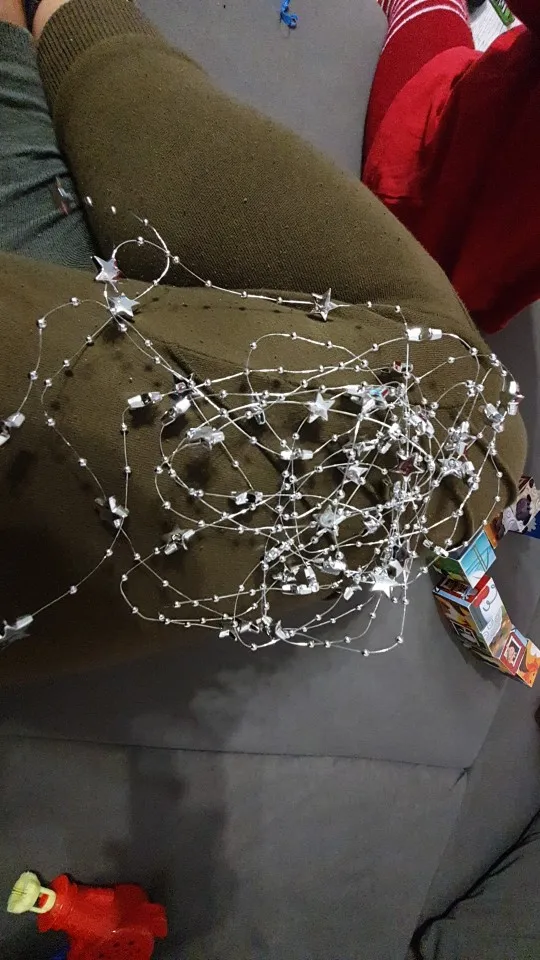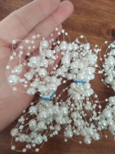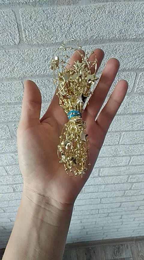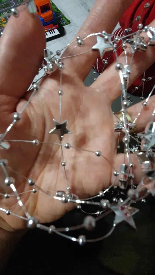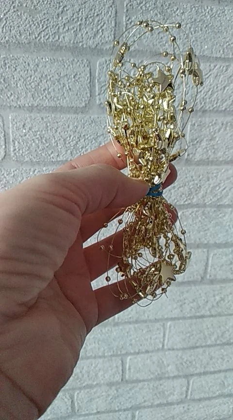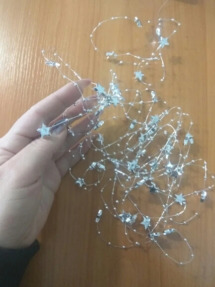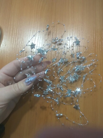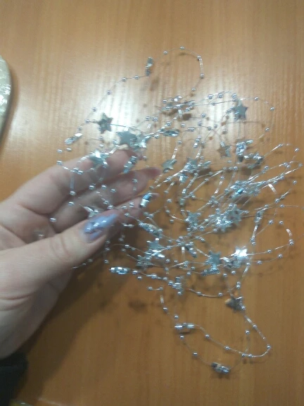 в целом все ок, по ощущениям сама нить как леска, немного осыпается с нее краска, но это не критично. режется легко ножницами. бусинки и звездочки пластиковые, окрашены. приходит не в катушке, как на фото, а просто мотком, скреплено резинкой