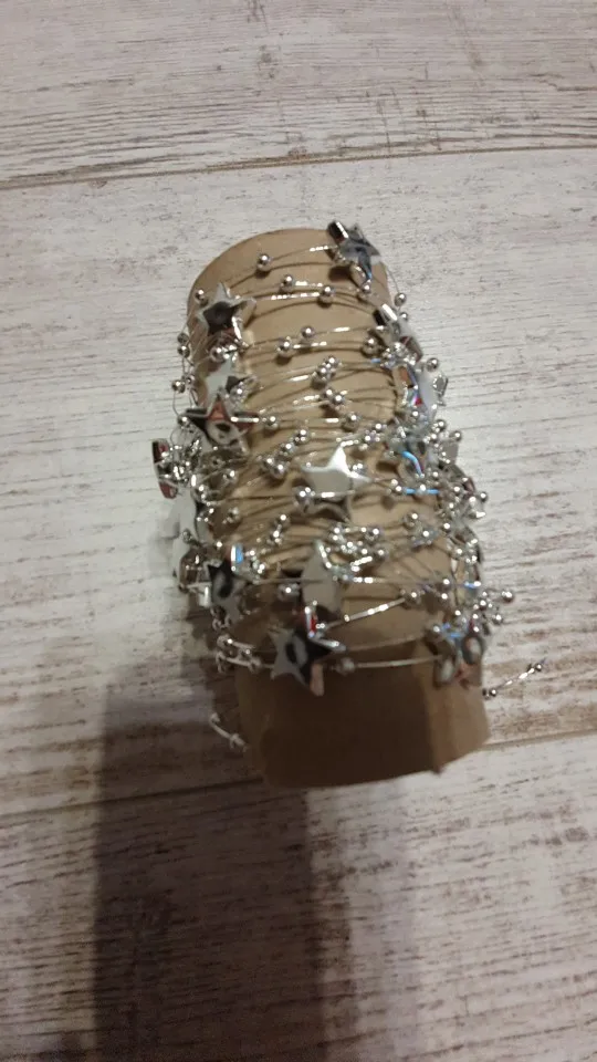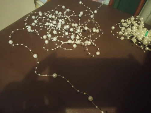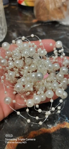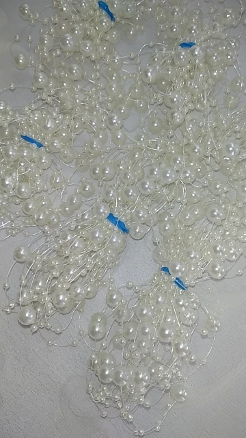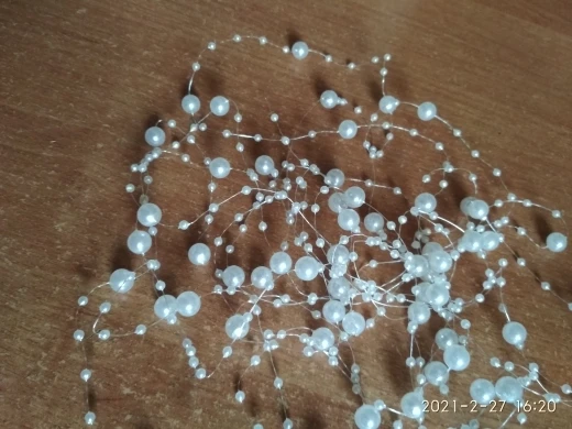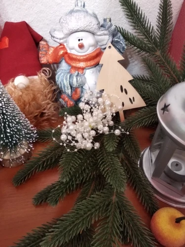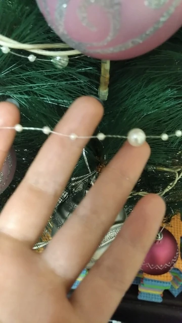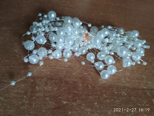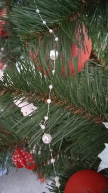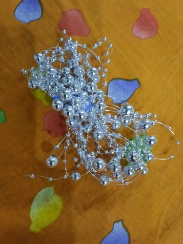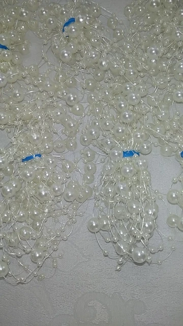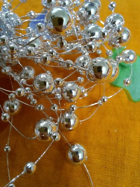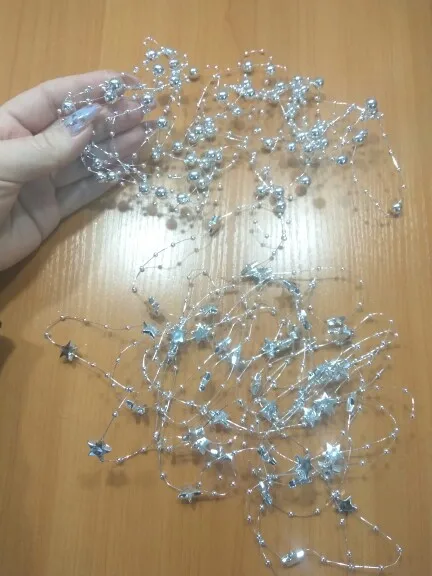 Серебристую нить заказала, так как граждане разных стран писали, что она самая качественная. Не могу согласиться. Мне показалось, что белая даже получше сделана. Смотрится нить с серебряными бусами нарядно. Елочку украшает.