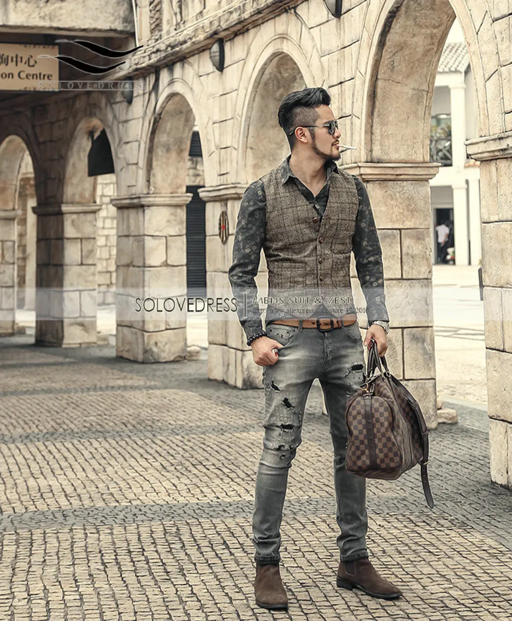 Новый клетчатый костюм, жилет для мужчин, шерстяной твидовый жилет,...