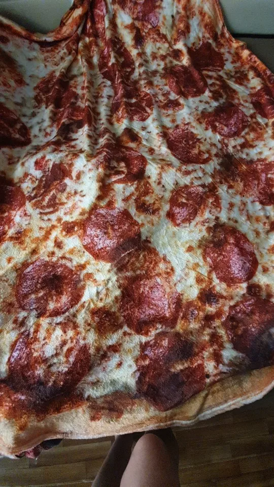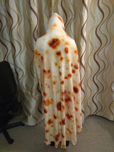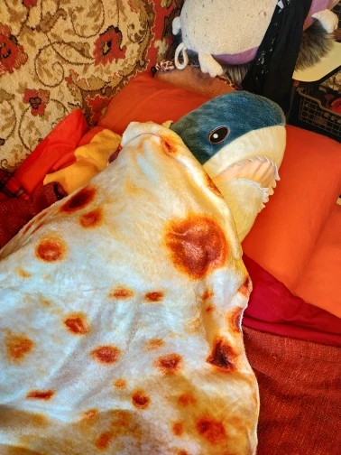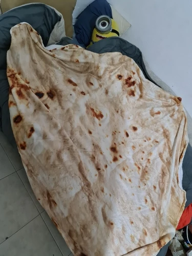 Неплохой пледик, мягкий, не очень тёплый. Покупала на новый год человеку, любящему шаурму :D