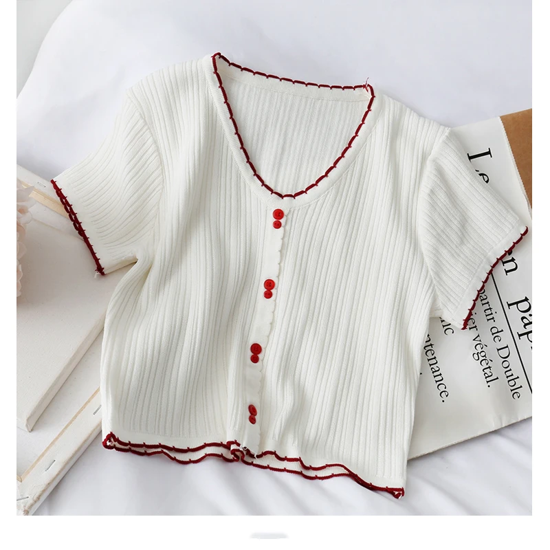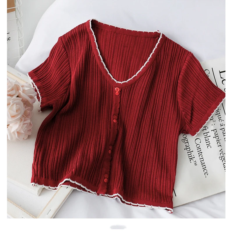 Женские футболки, вязаные милые короткие футболки, женские, на пуговицах, с v-образным вырезом, однотонные, с коротким рукавом, повседневные, 2020, летние футболки для женщин