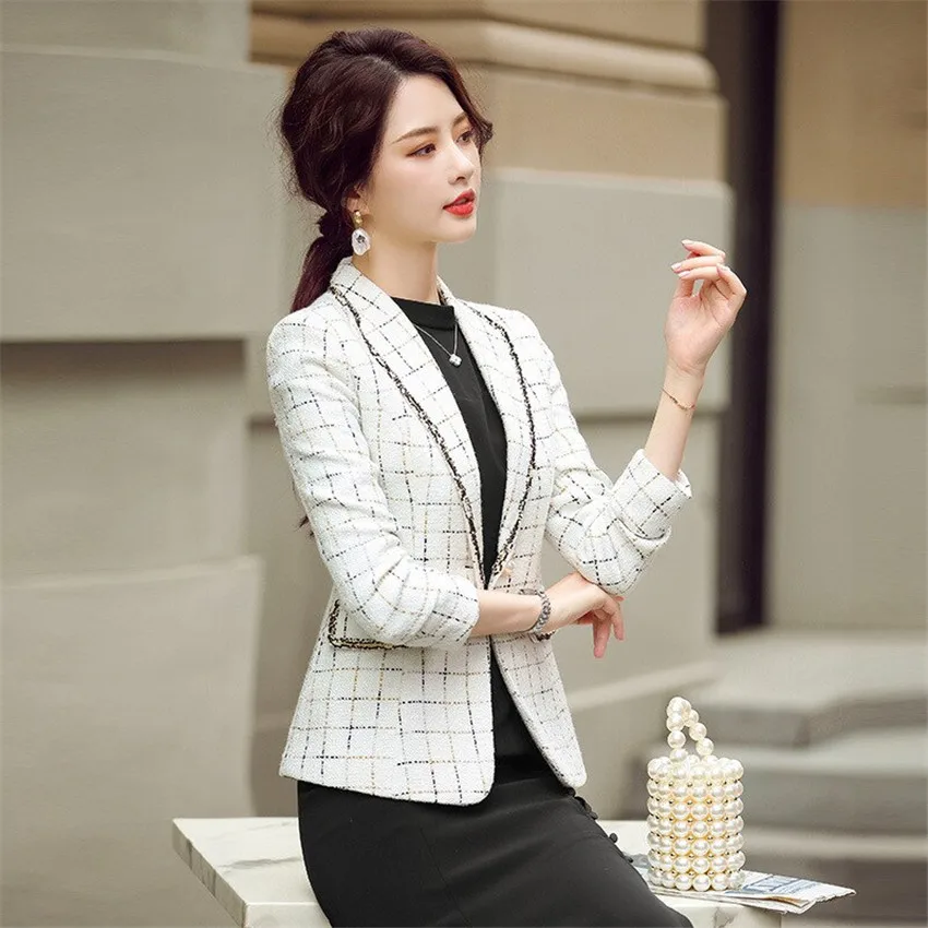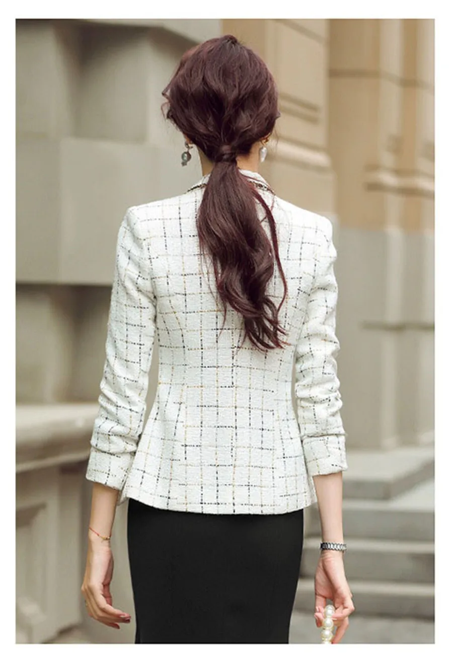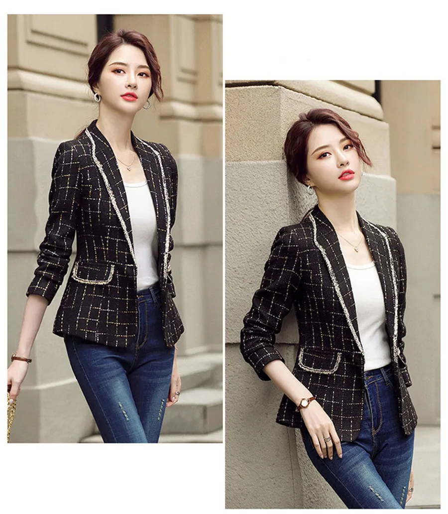 Элегантный осенне-зимний клетчатый женский пиджак, повседневный твидовый пиджак с длинным рукавом, офисный женский костюм с карманом, блейзер размера плюс