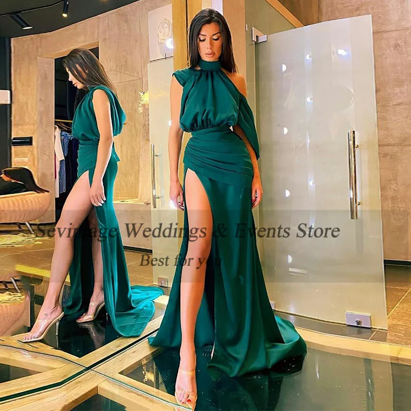 Женское атласное вечернее платье Sevintage, темно-зеленое плиссированное платье с высоким разрезом и лямкой на шее, платье для выпускного вечера со шлейфом, 2020