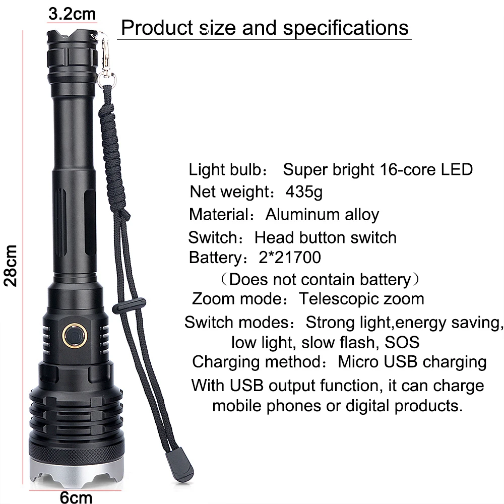USB-зарядка, отображение мощности 1. С использованием P110 (16core светодиодный) точечные лампы высокой яркости может достигать 5000 люмен, таким образом, и эти советы помогут продлить срок службы изделия составляет 100000 часов; 2. Выпуклая линза: Орлиный глаз выпуклая линза, хорошая светильник производительность передачи, не легко повреждается, сильная алюминиевая головная часть для защиты объектива от износа 3. Телескопический зум: растяните голову влево и вправо для масштабирования, режим концентрации астигматизма, удобно использовать в различных ситуациях; 4. Средний переключатель: высококачественный материал натурального каучука, нескользящая обработка поверхности, сенсорный переключатель светильник для переключения режима светильник; 5. Контакт с аккумулятором: конструкция контакта аккумулятора имеет хорошую проводимость и эффективно предотвращает плохой контакт.