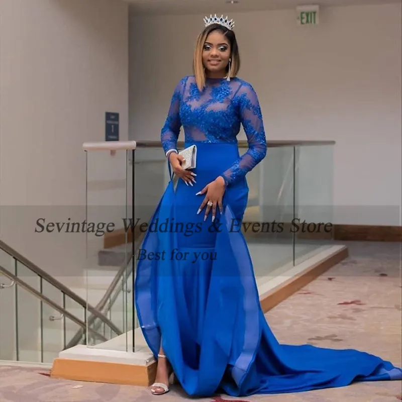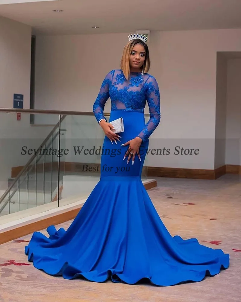 Женское вечернее платье-Русалка Sevintage, платье из атласа с длинным рукавом и круглым вырезом, кружевные вечерние платья для выпускного вечера