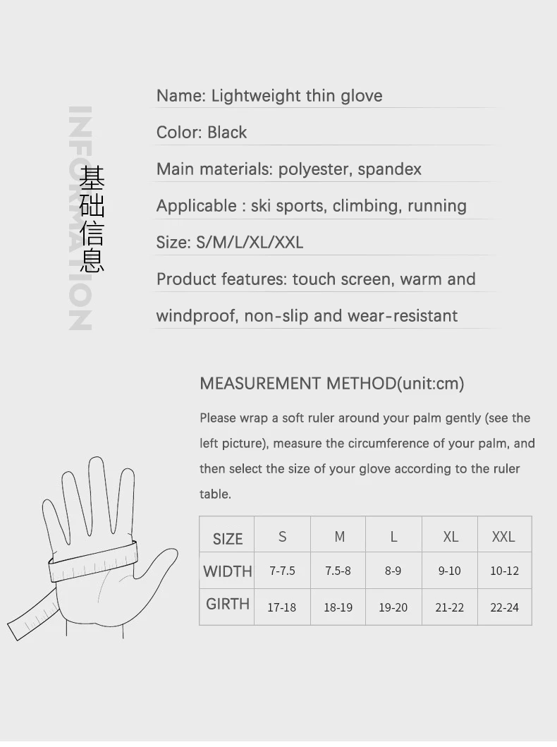 Название продукта: легкие тонкие перчатки для бега Пол: мужчин и женщин Размер: S, M, L, XL, XXL Цвет: черный Функция: сенсорный экран, ветрозащитный, легкий светильник, удобный, теплый Подходит для: спорта, альпинизма, велоспорта, бега,