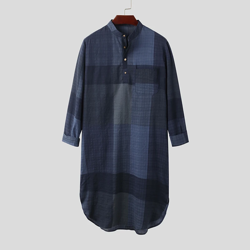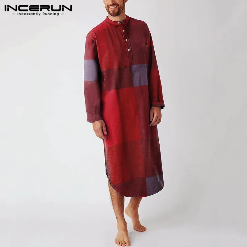 Мужской мусульманский кафтан INCERUN, Повседневный хлопковый кафтан в мусульманскую клетку с длинными рукавами и воротником-стоечкой, винтажная Арабская одежда, 2021