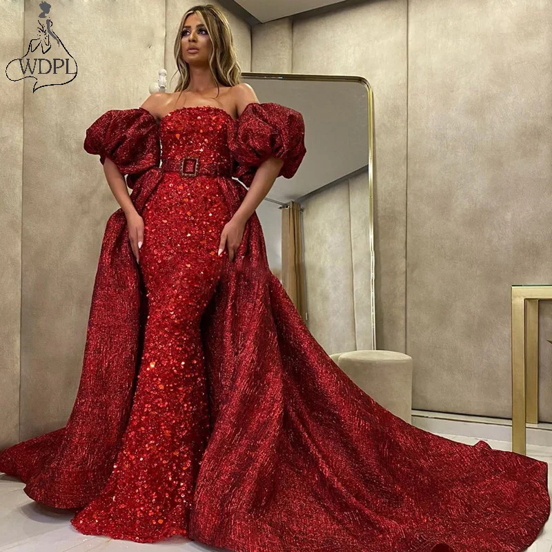 Женское платье с пышными рукавами, длинное Бордовое платье-Русалка с отстегивающейся юбкой, вечернее платье с блестками в Дубае, для выпускного вечера, 2020