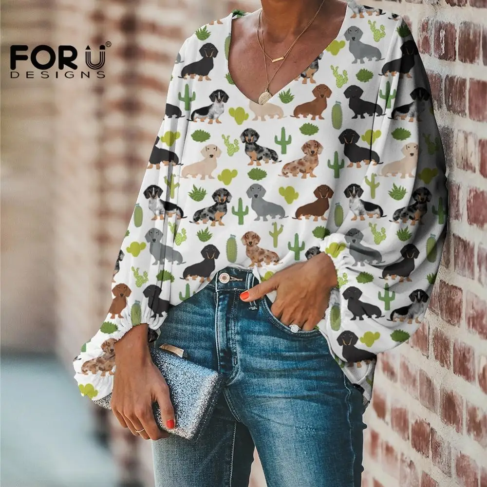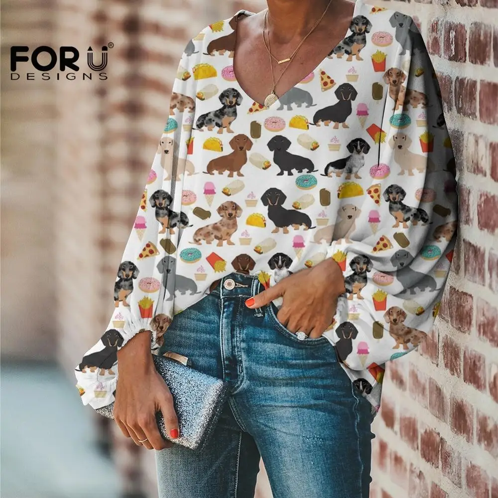 Милая шифоновая блузка FORUDESIGNS в стиле Харадзюку для женщин, шоколадно-Коричневые рубашки с принтом таксы и собаки для женщин, повседневные модные рубашки