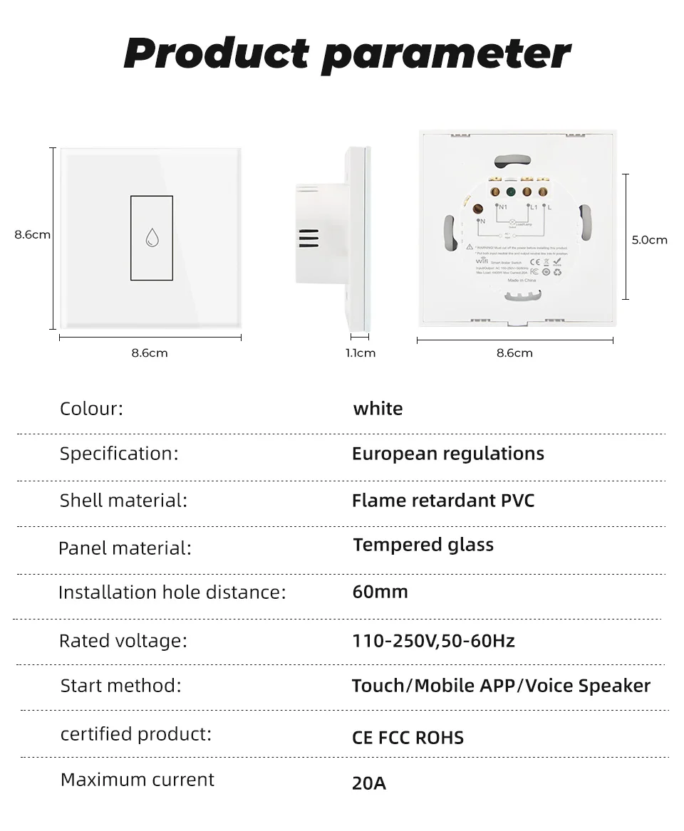 Цвет: белыйСпецификация: европейские правилаМатериал корпуса: огнестойкий ПВХМатериал панели: закаленное стеклоРасстояние установочного отверстия: 60 ммНоминальное напряжение: 110-250 В, 50-60 ГцСпособ запуска: Touch/мобильное приложение/Голосовой динамикСертифицированный продукт: CE ROHSМаксимальный ток: 20А