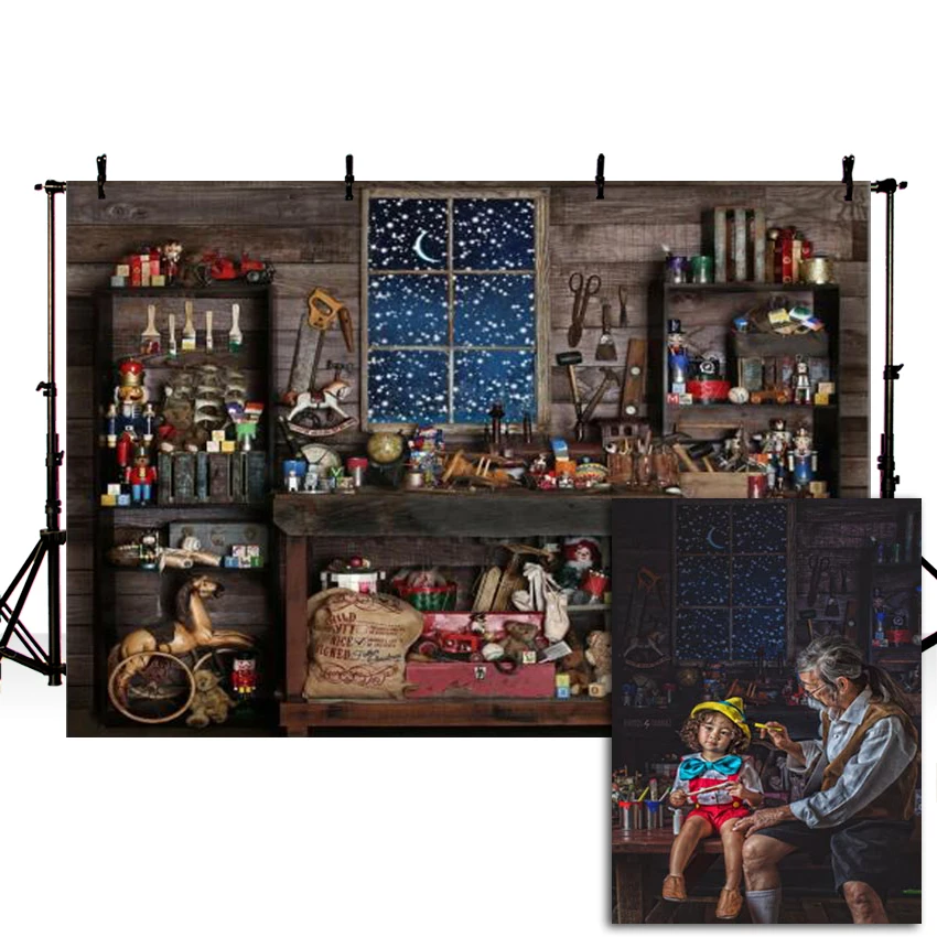 Рождественский фон магазин Санта магазин снег окно деревянный стол механические инструменты фотографии фоны для фотостудии