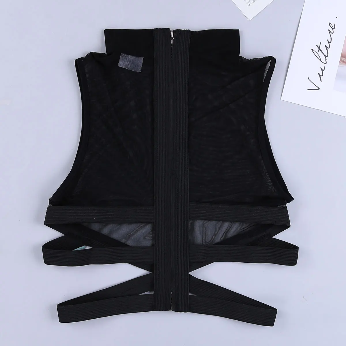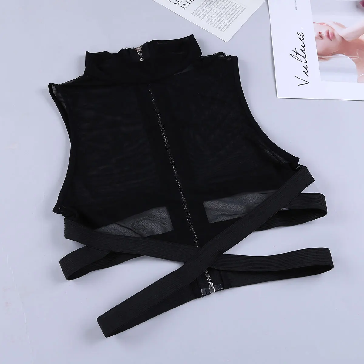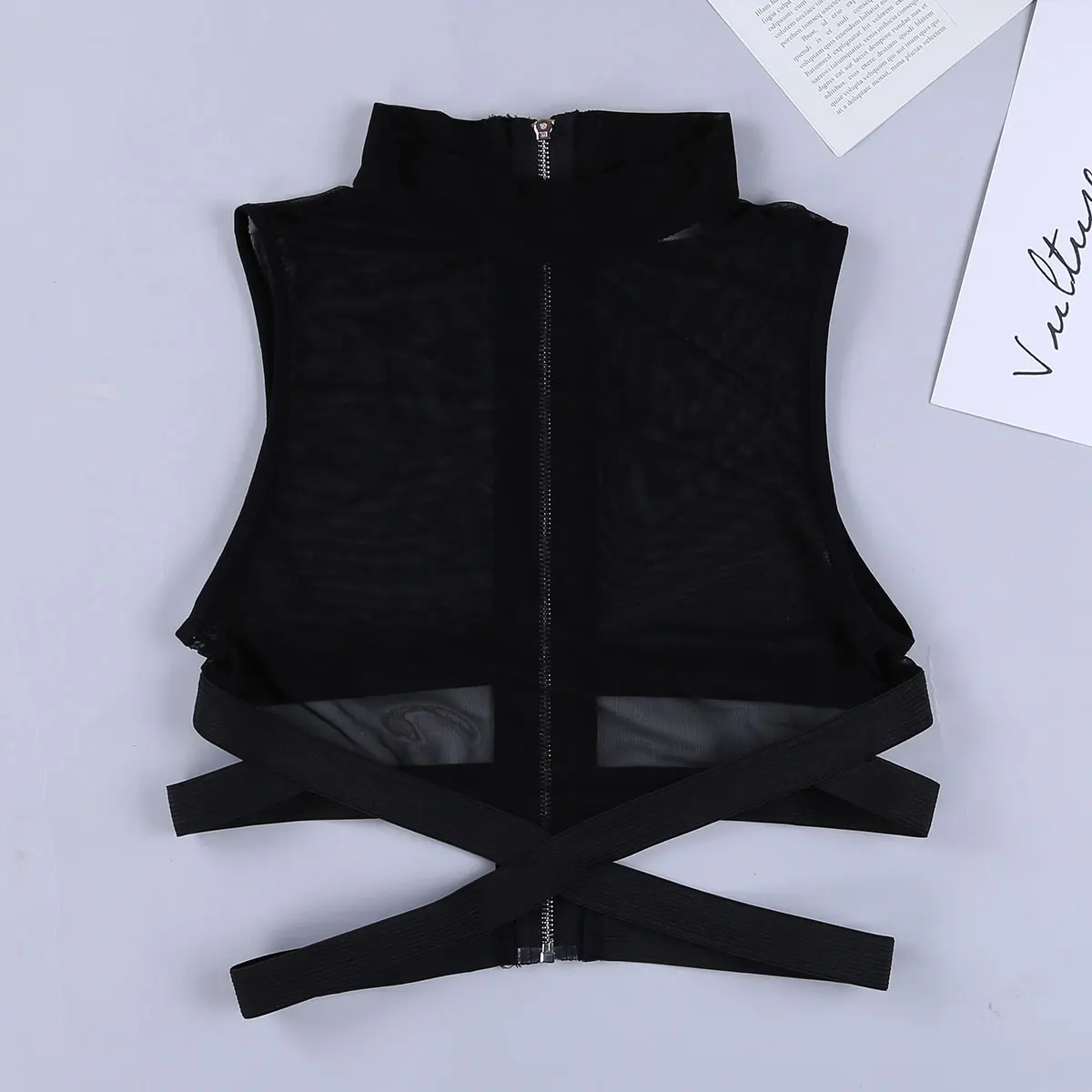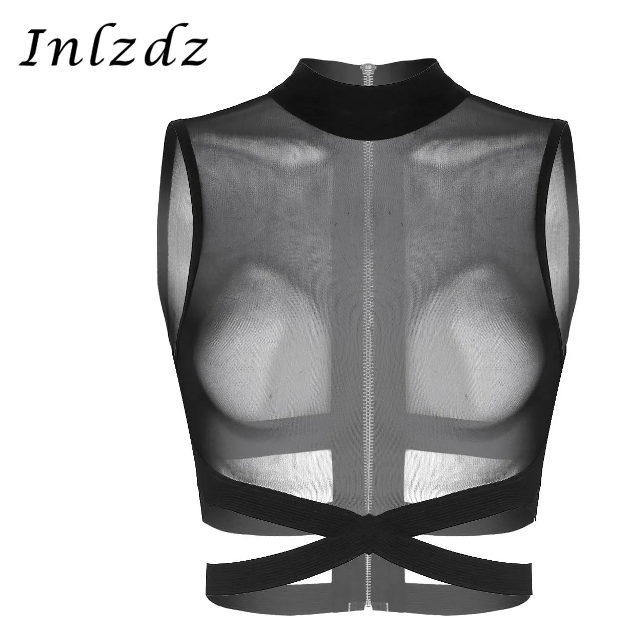 Женский топ для полярного танца, прозрачная музыкальная одежда, сетчатый эластичный укороченный топ на молнии сзади с бретельками и перекрестными бретельками, рубашки