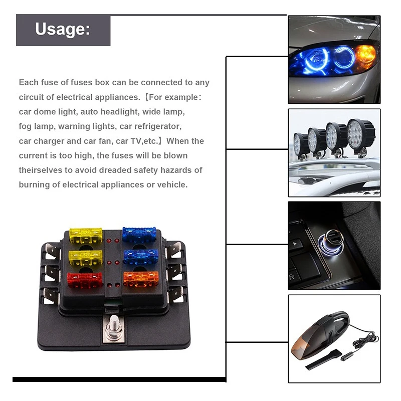 [Название продукта]: 1 Входной и 6 выходных предохранителей с светодиодный индикатором [секция терминала ПК][Размер товара]: 7x8.5x3.5см[Материал изделия]: корпус PBT, водонепроницаемый пылезащитный чехол из поликарбоната, никелированный медный Соединительный терминал, наклейка PPX40[Входное Номинальное напряжение]: 32 В[Номинальный входной ток]: 100A[Характеристики входного провода]: #4-6 AWG[Максимальный выходной ток]: 30A на цепь[Спецификация выходного провода]: #12-16 AWG[Функция индикатора]: когда красный светодиодный индикатор горит, это означает, что предохранитель отключен. Необходимо вовремя заменить предохранитель, чтобы продолжить работу.[Диапазон установки продукта]: может быть установлен на автомобилях, Yueshu, RV, автобусах, яхтах, лодках и т. д.[Диапазон использования продукта]: он может быть непосредственно подключен к линии любого электрического прибора на автомобиле/корабле [Например: лампа на крыше, автомобильный головной светильник, ширина лампы, противотуманная фара, предупреждающий светильник, автомобильный холодильник, автомобильное зарядное устройство, автомобильный вентилятор, автомобильный телевизор и т. д.