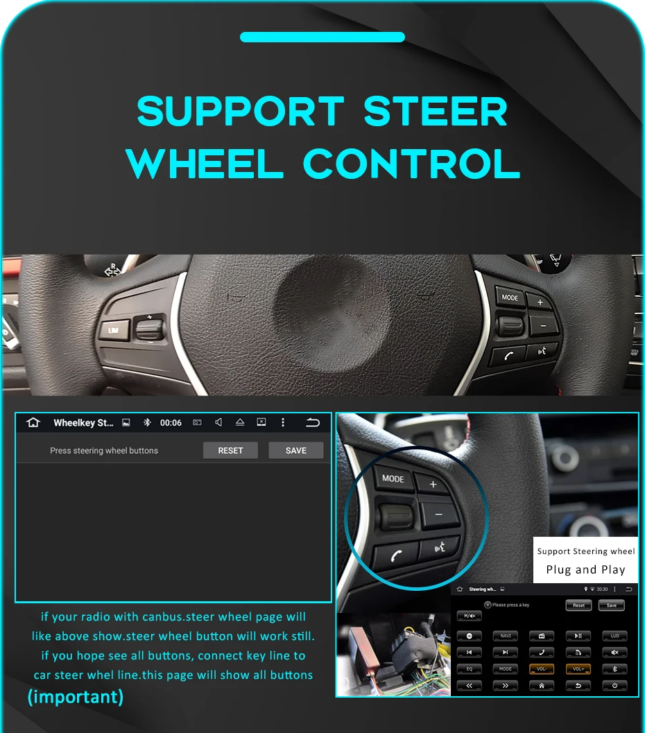 Функция управления поворотным колесомВсе радиоприемники в нашем магазине поддерживают функцию управления поворотным колесом. Кнопки рулевого колеса вашего автомобиля могут управлять нашим радио после установки радио. (однако страница рулевого колеса обычно пуста. Если вы хотите увидеть кнопки aoo на странице рулевого колеса, вы можете просто подключить ключевую линию к линии рулевого колеса автомобиля, тогда вы увидите все кнопки рулевого колеса на странице)Если кнопки поворотного колеса не работают, пожалуйста, не волнуйтесь и не спорьте, пожалуйста, оставьте нам сообщение, мы поможем вам сделать его работать на 100%.