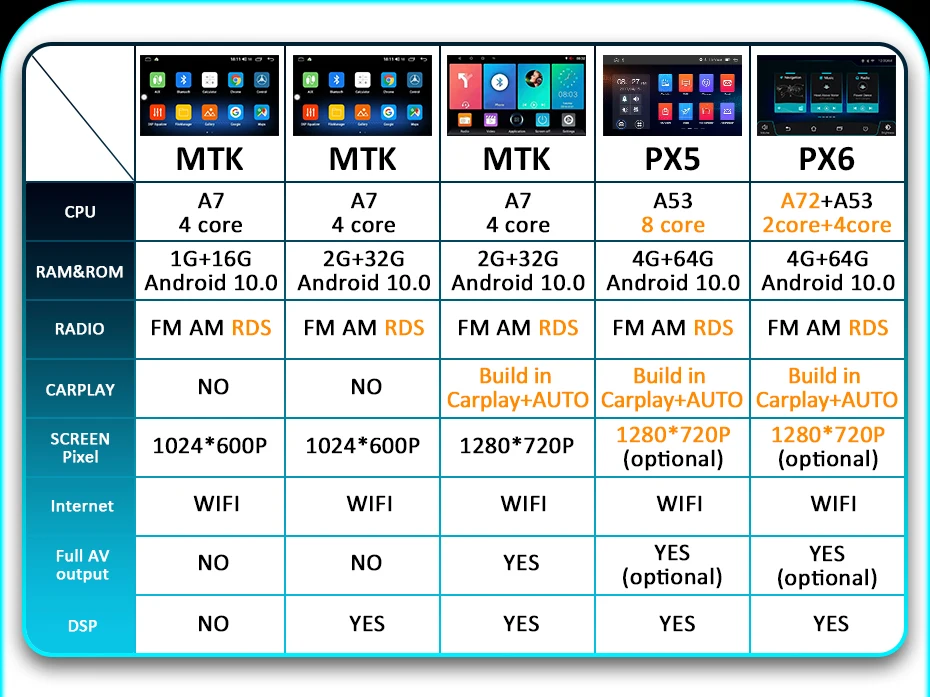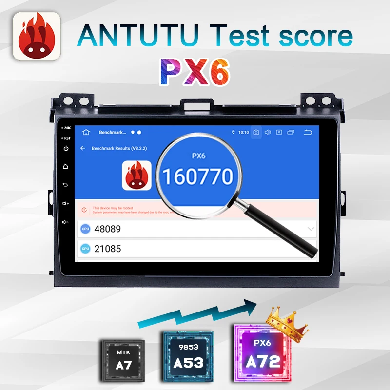 PX6PX6 является лучшим чипом на рынке в настоящее время, он работает быстрее, чем все другие типы. Балл ANTUTU составляет 160770, что лучше 9853 4G + 64G, PX5 и всех других типов 4 + 64G на рынке. По сравнению с другими радио типа fo, PX6 radio может загружать больше видов приложений android с android market, и приложение может работать лучше.