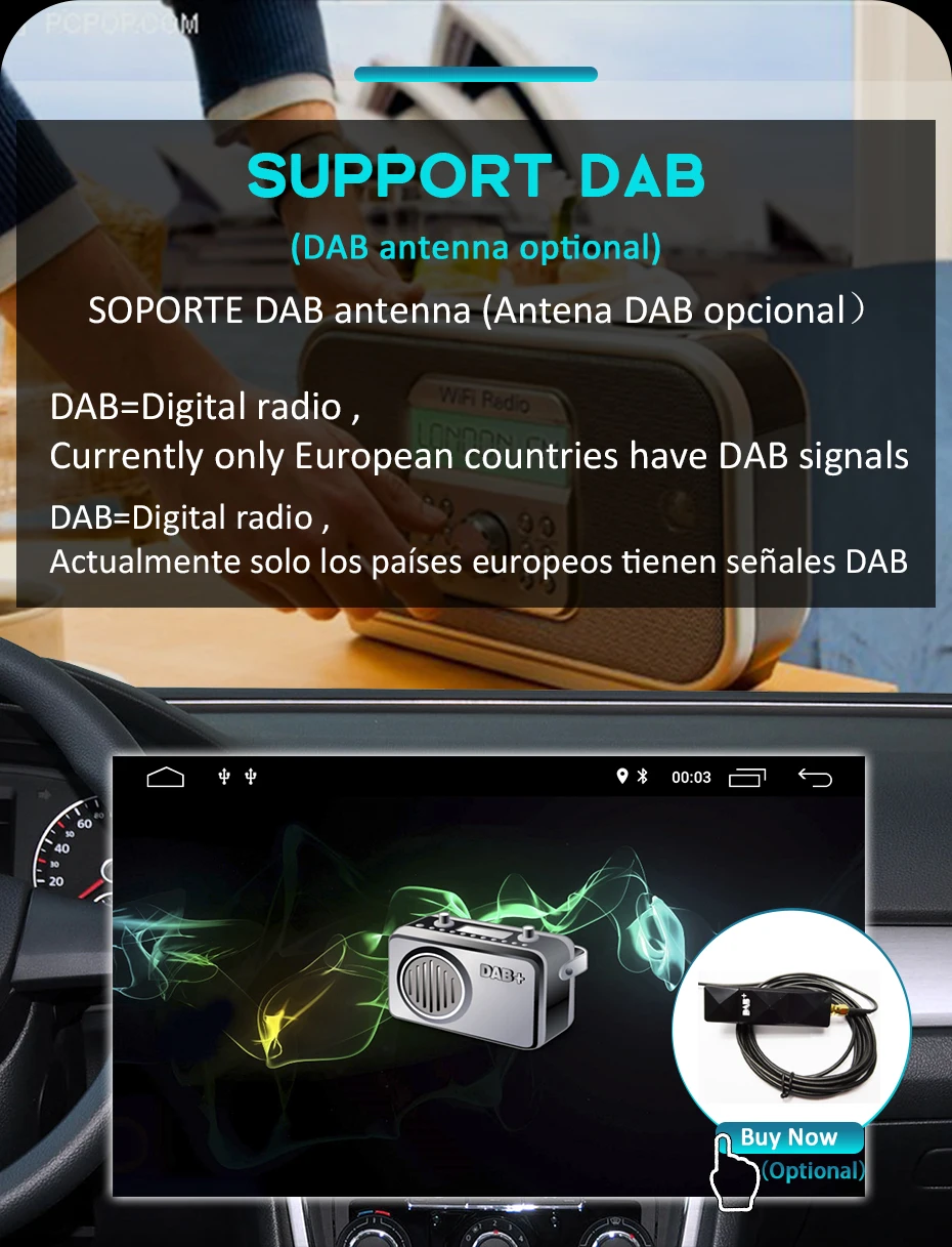 DABDAB-Это цифровое радио. Если в вашем городе есть цифровой радиосигнал, мы предлагаем вам купить DAB антенну, это гораздо лучше, чем FM AM RDS, он работает идеально без шума. Если нет цифрового радиосигнала, пожалуйста, не покупайте его.