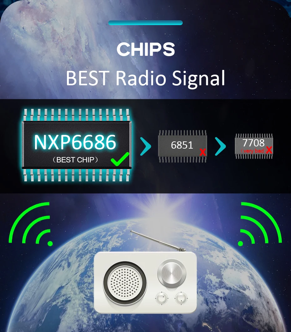 ЧипыРадио использует лучший усилитель chip-TDA7851L.TDA7851L является лучшим амплитудным IC на рынке в настоящее время. Лучше, чем 7388, и все остальные. Это делает качество звука автомобиля лучше, чем у других типов радио. Если вам нужно лучшее качество звука, мы предлагаем вам также выбрать функцию DSP, DSP-это система цифрового усилителя, которая предлагает лучшее качество звука.