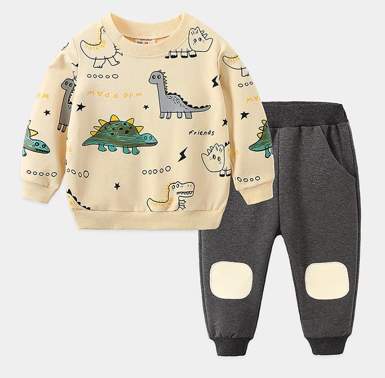 2020 хлопковые костюмы для мальчиков 2-6 лет, толстовка + штаны, Детские комплекты с длинными рукавами и рисунком, комплекты одежды с круглым вырезом и динозавром для мальчиков