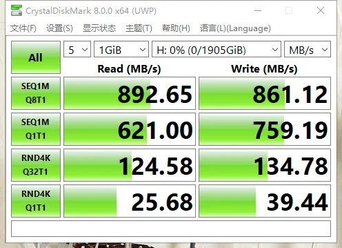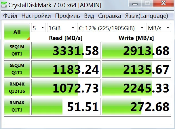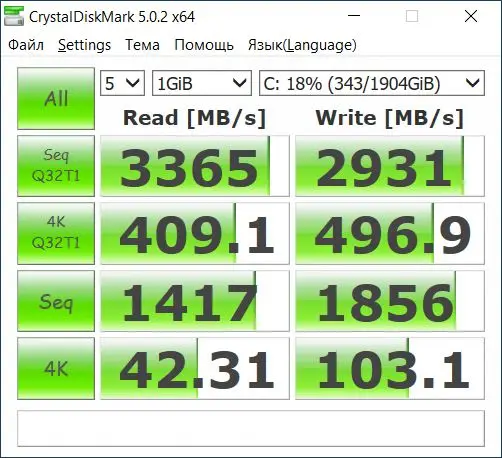 Хорошо, после форматирования бренда, который имеет 1904 ГБ. Замечательная скорость чтения/записи. 2 теста, сделанные с USB 3,0 и Type C (самый быстрый). Я использую корпус NVMe, чтобы носить его в кармане.