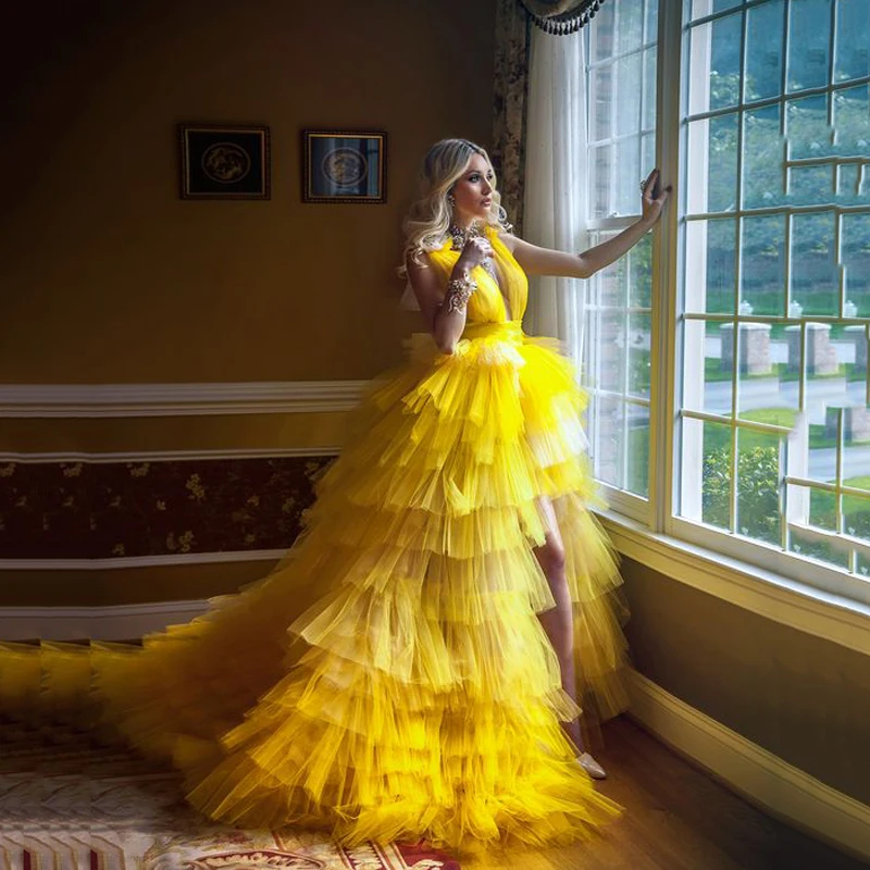Желтое Сетчатое Пышное вечернее платье без рукавов, многослойное платье с оборками и шлейфом на заказ, платье для выпускного вечера, вечернее платье на молнии сзади