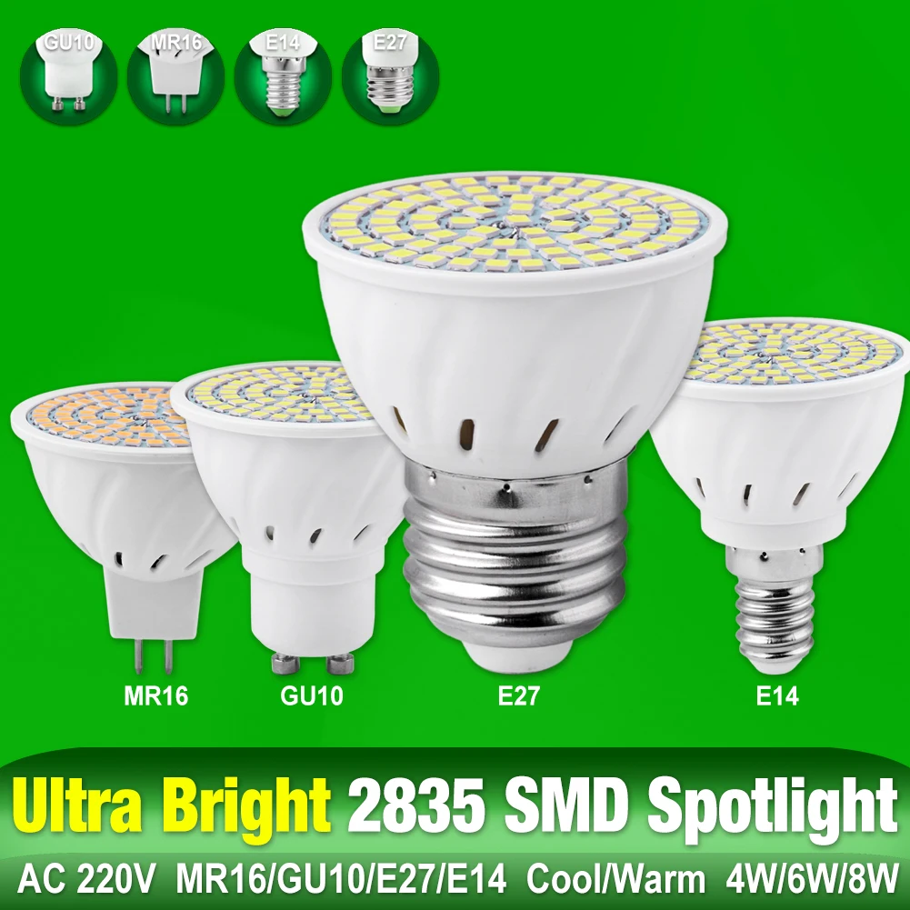 GU10 E27 MR16 E14 AC лампа Светодиодная лампа база Высокая яркость 2835 220 В 48 60 80 светодиодов лампада точечная лампа bombillas 4 Вт 6 Вт 8 Вт Светодиодная лампа MR16